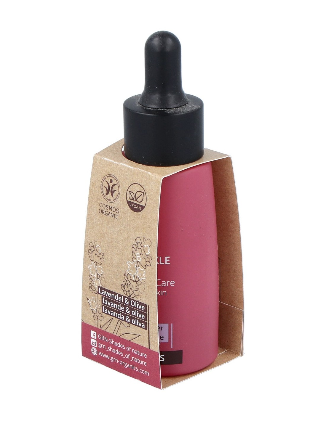 Aceite facial antiarrugas indicado para pieles maduras y secas. Contiene extracto de lavanda relajante y aceite de oliva hidratante, también contiene aceite de jojoba y argán que alisa, nutre y calma la piel. Fórmula vegana. Producto certificado Cosmos Organic.