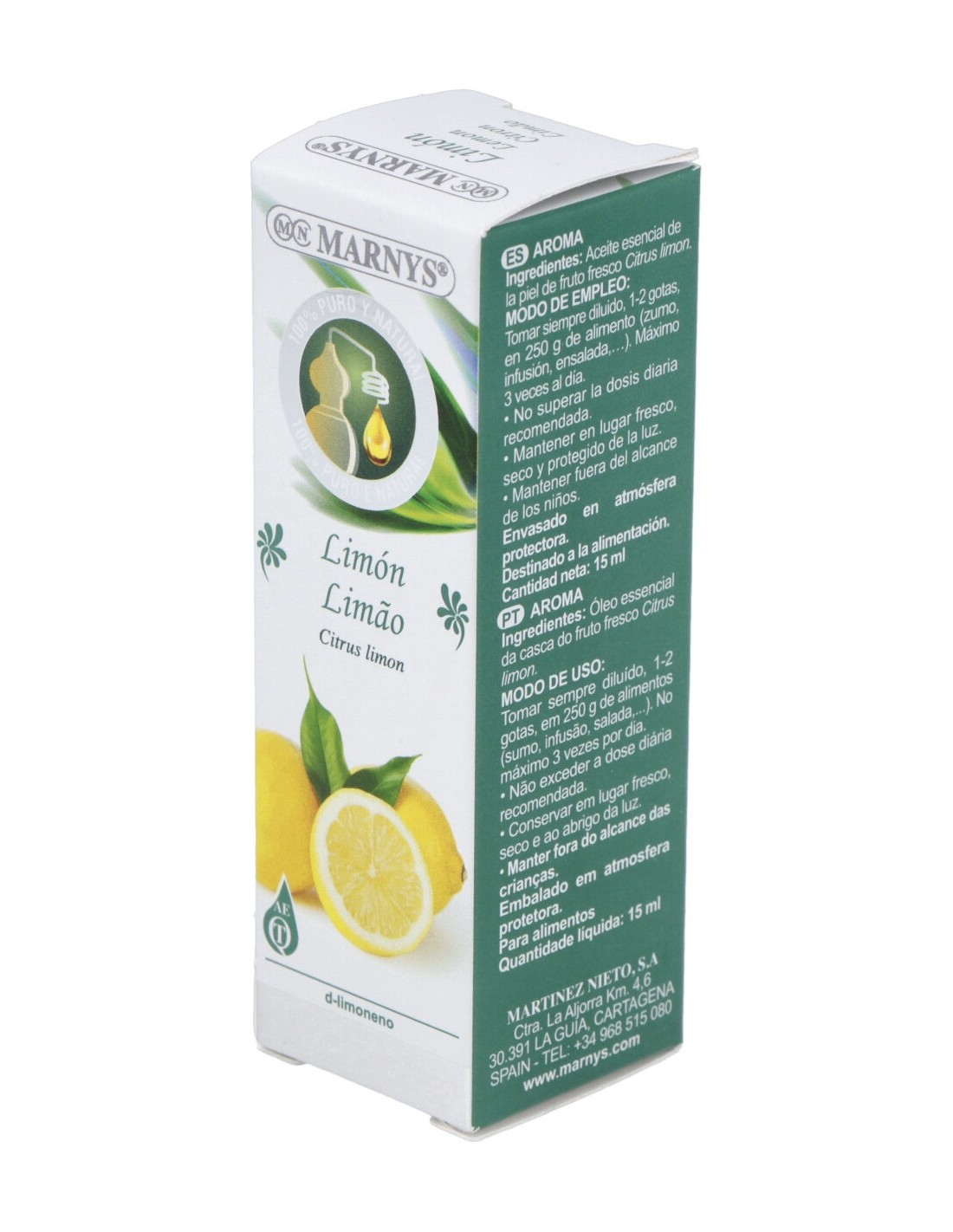 Aceite esencial de Limón (Citrus medica limonum peel oil), obtenido de la destilación de la cáscara fresca del fruto. Quimiotipo: d-limonene.