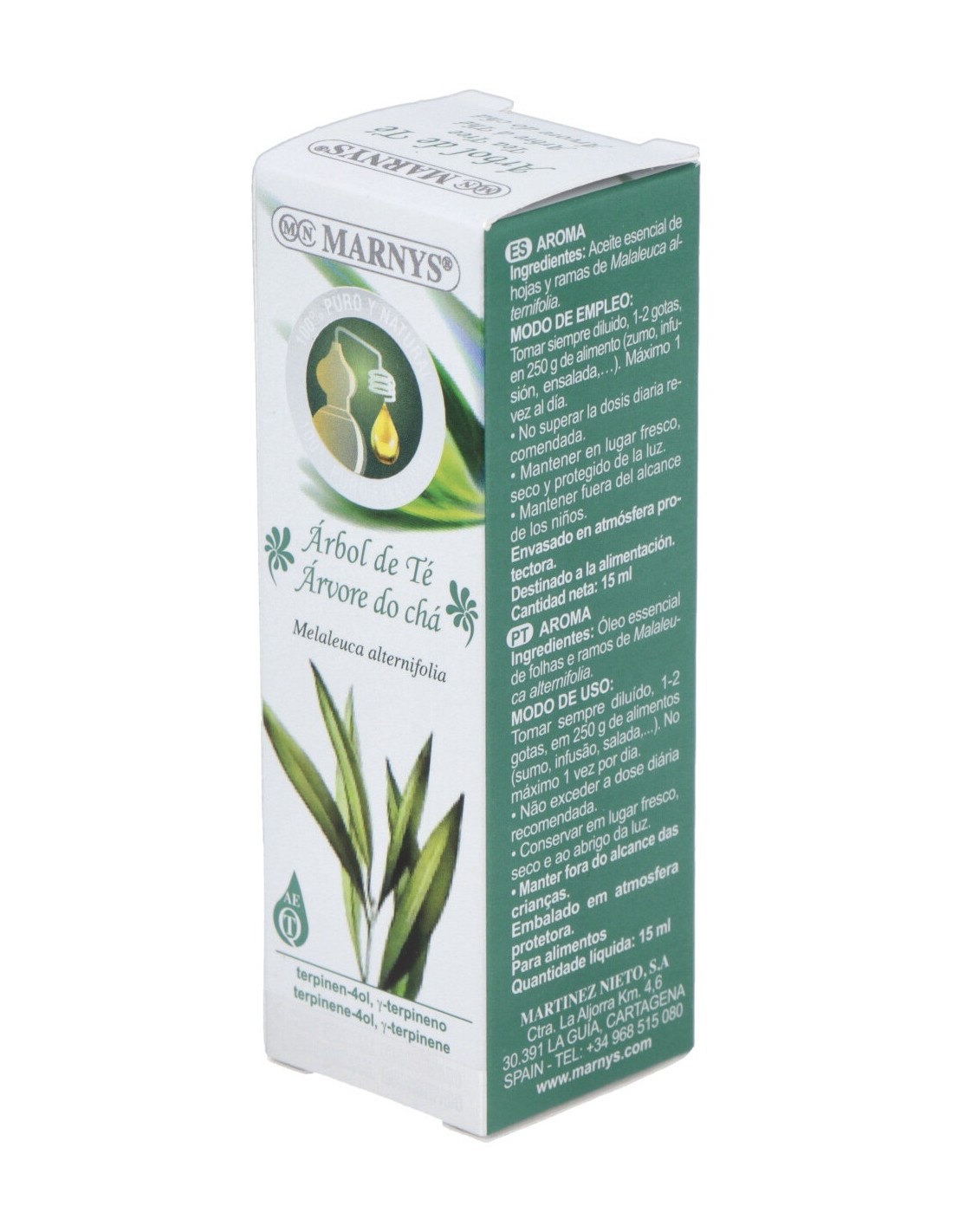 Aceite esencial quimiotipado de árbol del té (Melaleuca alternifolia) obtenido por destilación por arrastre de vapor de de las hojas y ramas de los árboles té australianos. Es un aceite con un fuerte y fresco aroma.