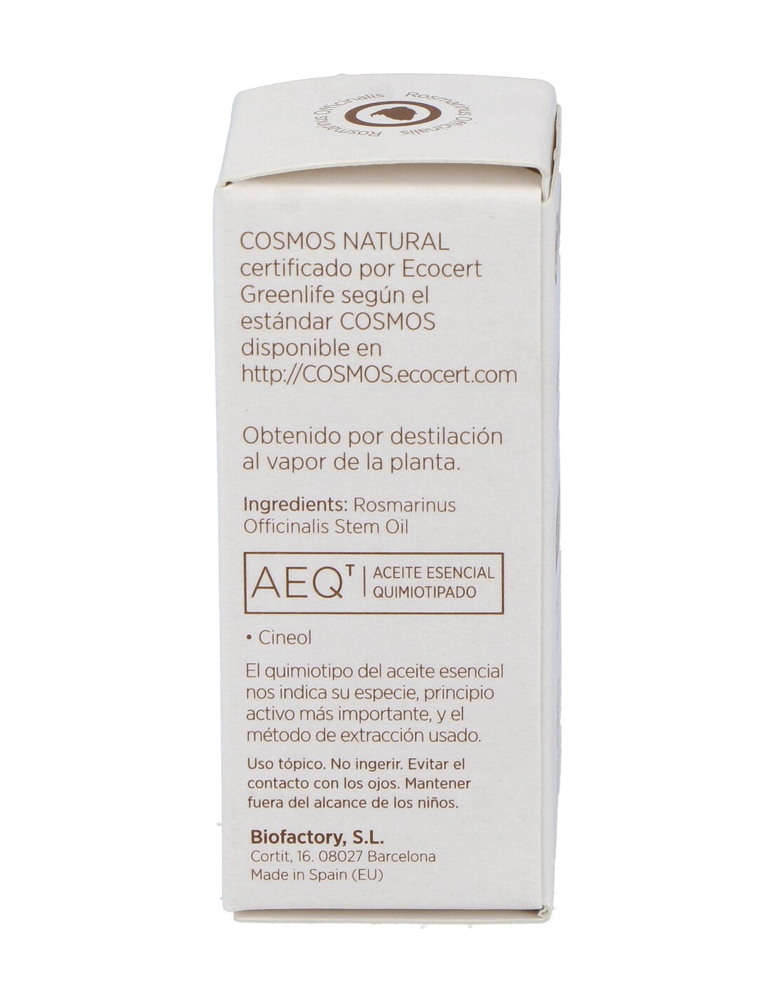 Aceite esencial 100% puro de Rosmarinus Officinalis Oil, obtenido por destilación al vapor de la planta. Con Cineol como principio activo.