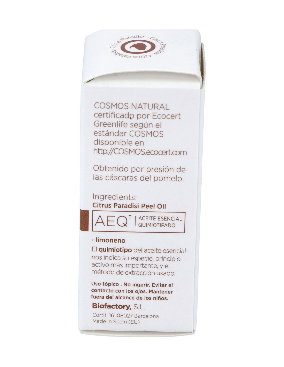 Aceite esencial 100 % puro de Citrus Paradisi, obtenido por presión de las cáscaras del pomelo. Con limoneno como principio activo.