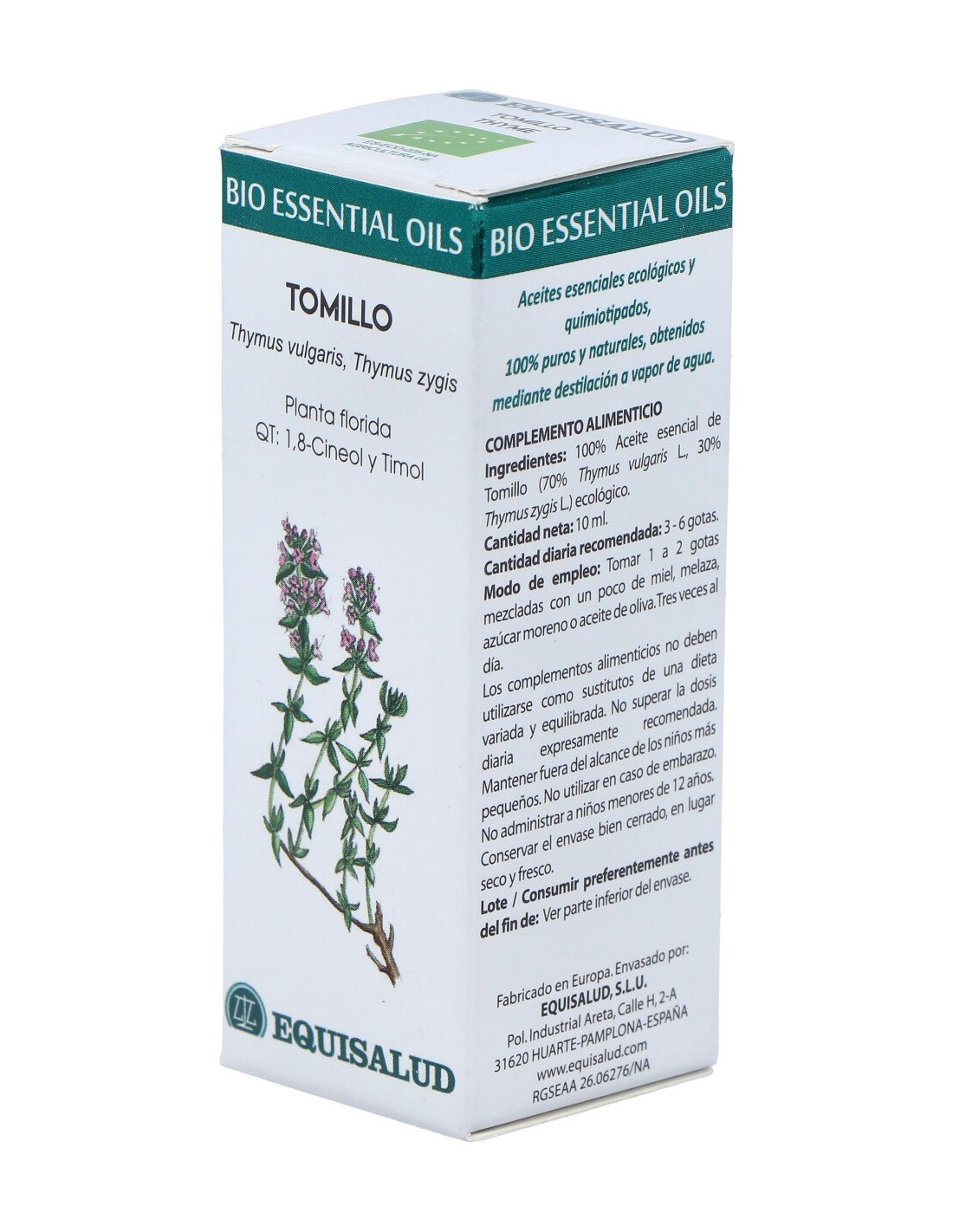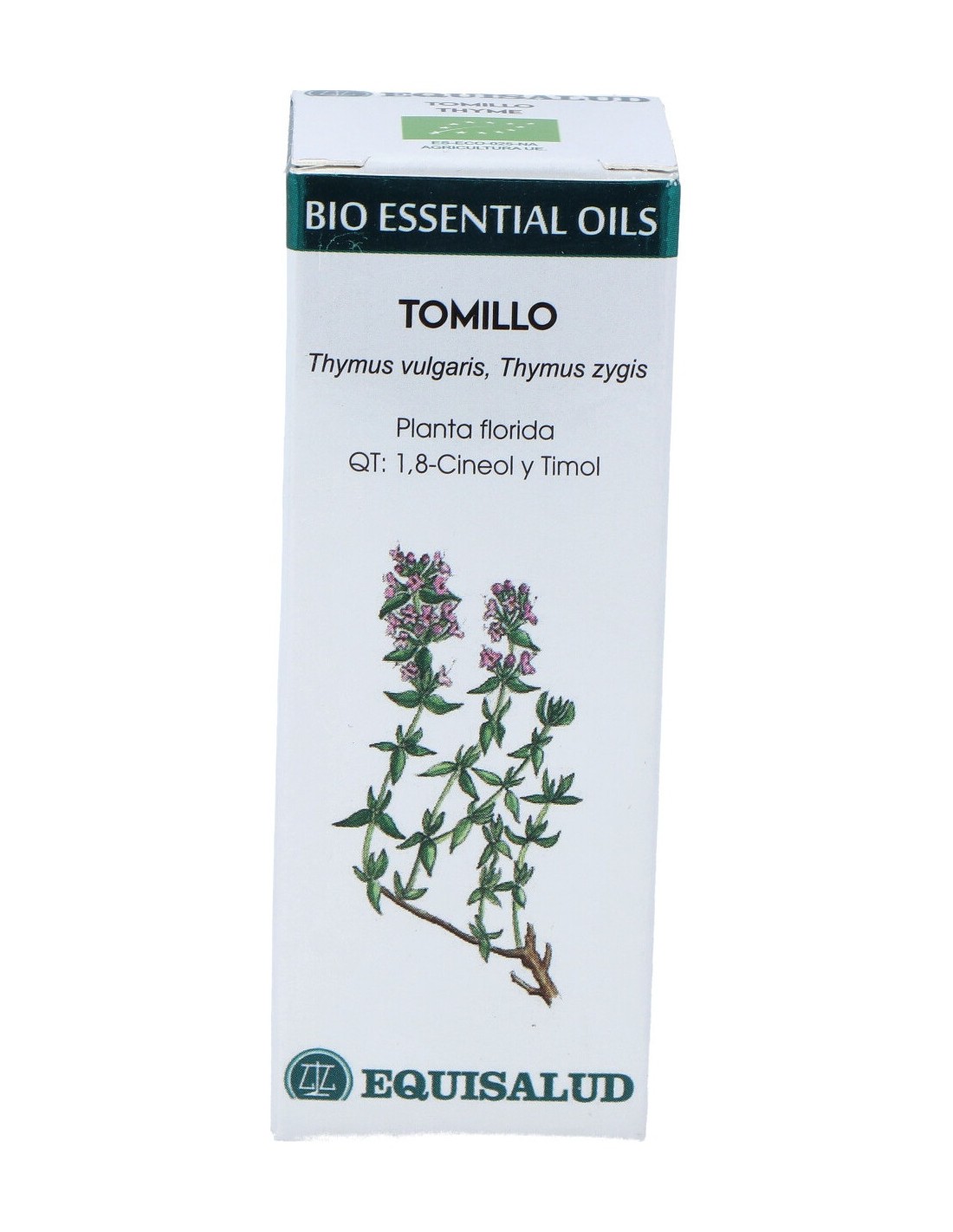 Planta florida. QT: 1,8-Cineol y Timol 100% aceite esencial de tomillo (70% Thymus vulgaris L., 30% Thymus zygis L.) ecológico.