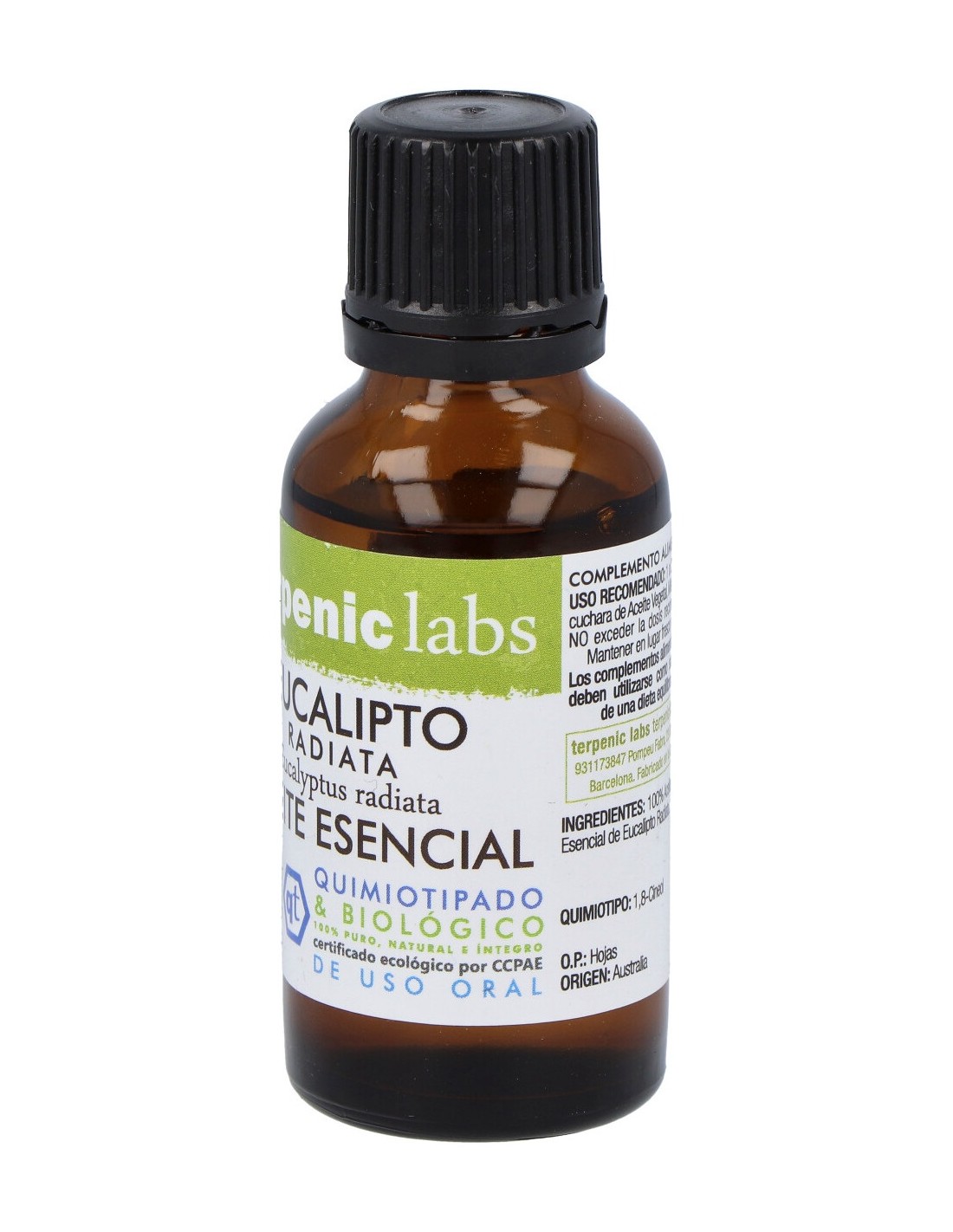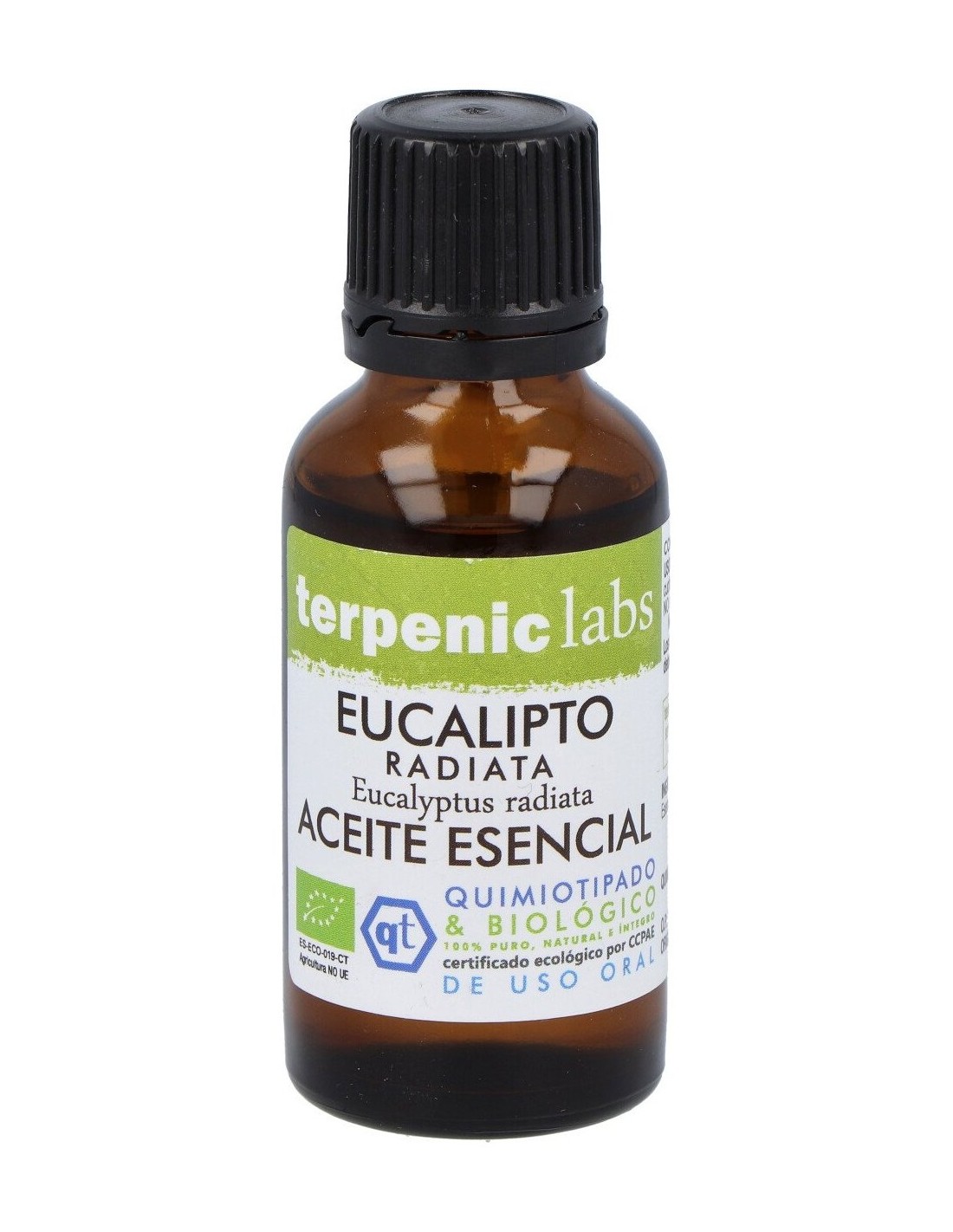 Aceite esencial de Eucalipto radiata. El producto es 100% extracto natural con origen en Australia, el cual contiene ecoetiqueta que certifica el origen ecológico dentro de la unión europea. Aceite esencial Bio quimiotipado 100% natural, puro e íntegro. Facilita distintas propiedades: Mucolítico, expectorante, respiratorio, descongestionante y antibacteriano.El aceite esencial se obtiene por destilación con arrastre de vapor de las hojas. Está indicado en casos bronquitis, sinusitis, otitis, gripe. Precauciones de uso: no usar durante los primeros 3 meses de embarazo.