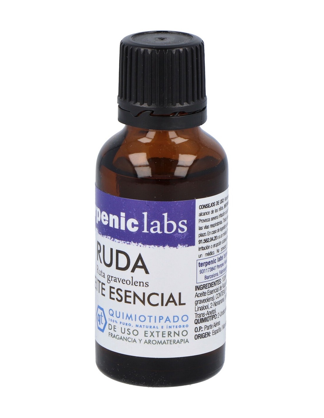 Aceite esencial de Ruda. Composición 100% puro, íntegro, natural y quimiotipado. Extracto obtenido 100% de Ruta graveolens. Producto con certificado ecológico de la unión europea. El producto facilita distintas propiedades: antiparasitario, antihelmíntico rubefaciente, venotónico, antiespasmódico. Apto para casos de varices, hemorroides, reumatismo, psoriasis y espasmos gastrointestinales. Precauciones de uso: No emplear durante el embarazo y lactancia. Fotosensibilizante, no exponer la piel al sol ni rayos UV tras su aplicación. Uso exclusivo del terapeuta.