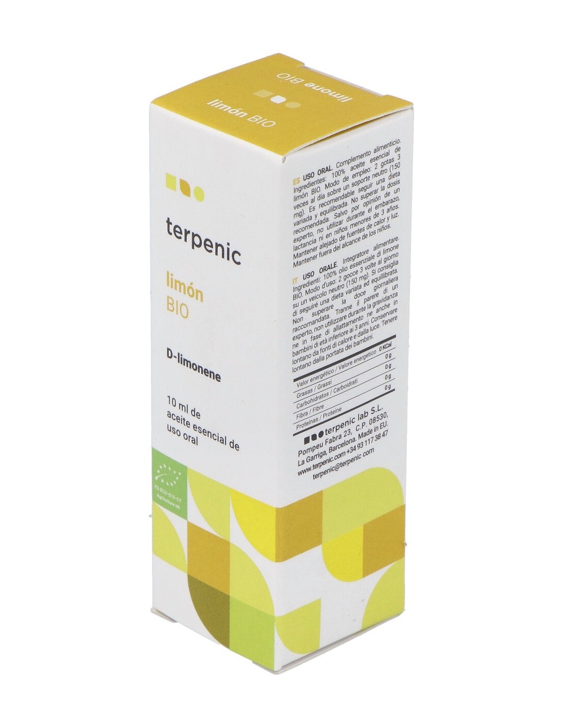 Aceite esencial Bio 100% puro de Citrus limonum (QT. limoneno) de Italia, obtenido de la corteza.