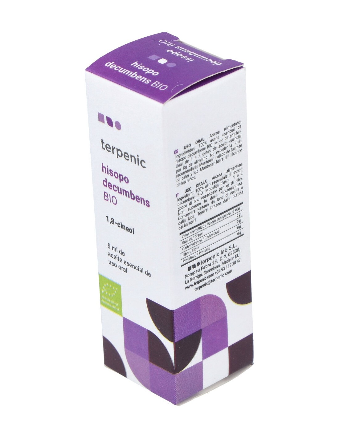 Aceite esencial bio 100% puro de H.officinalis decumbens (QT. 1,8-cineol) de Francia, obtenido de la planta.
