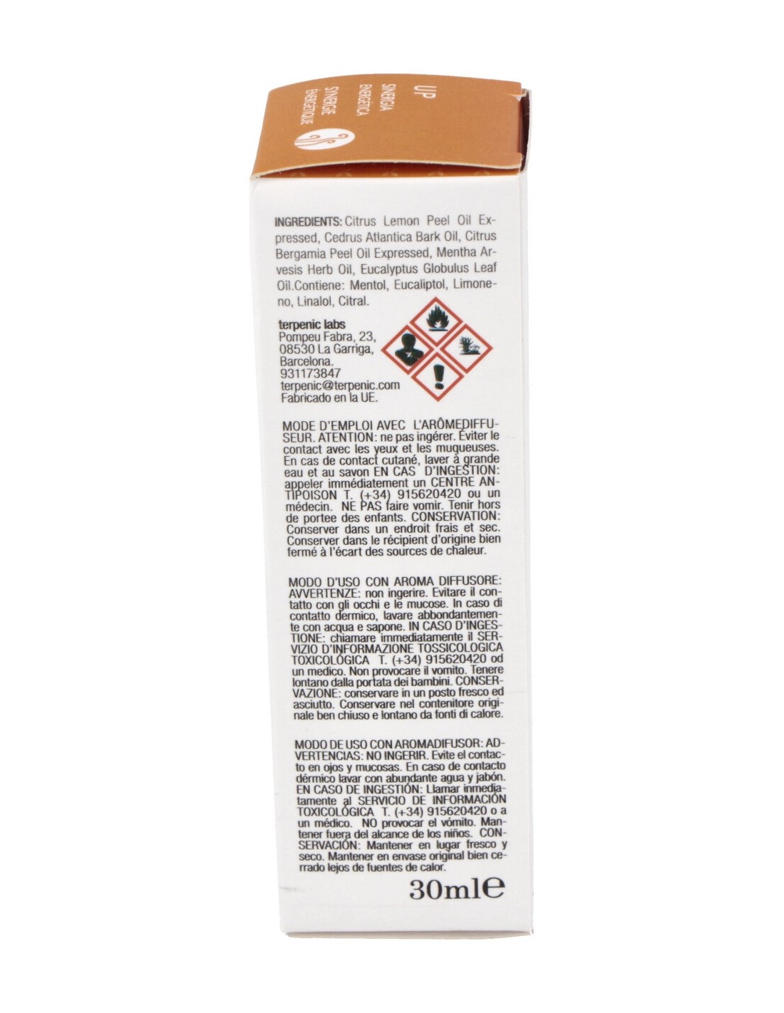 Limón (Citrus x Limon), Bergamota (Citrus x Bergamia), Menta Piperita (Mentha x Piperita), Cedro Atlas (Cedrus Atlantica), Eucalipto (Eucalyptus Globulus).