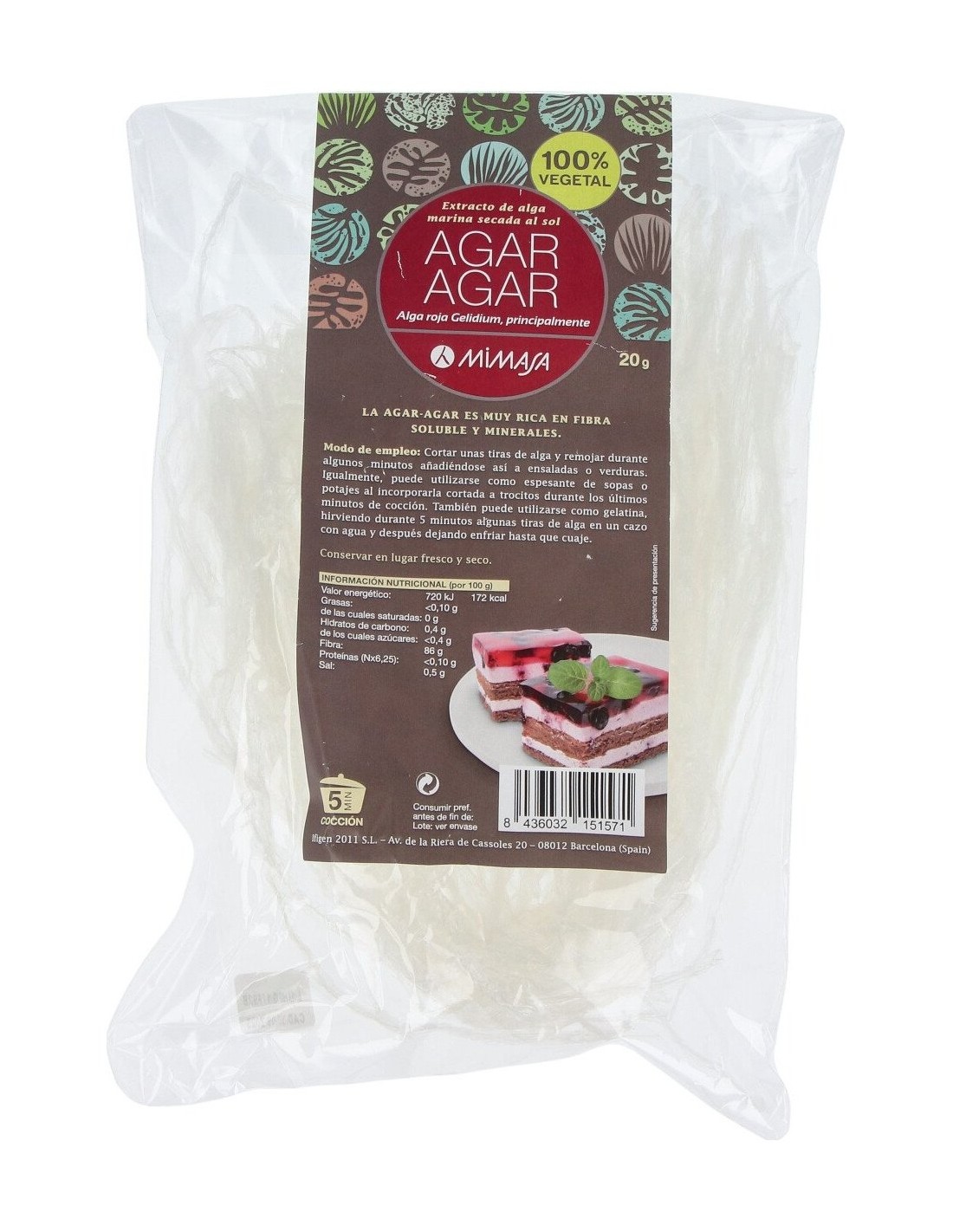 Tiras de alga agar-agar, que es la gelatina marina de más alta calidad, y que está compuesta por la fibra soluble que se extrae del alga Gelidium Sesquipedale. Se puede usar como espesante o gelificante en postres como tartas, natillas o sorbetes, o en platos para hacer salsas o sopas. No aporta ningún tipo de sabor y es muy rica en fibra, sodio, potasio, calcio y magnesio. También se puede añadir directamente a ensaladas, basta con hidratar durante unos minutos, hasta conseguir la textura deseada.