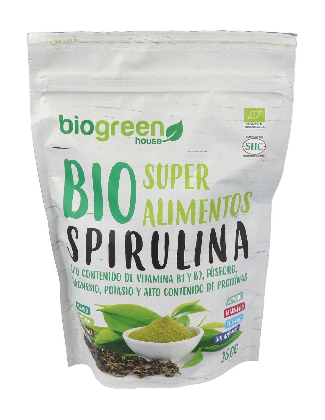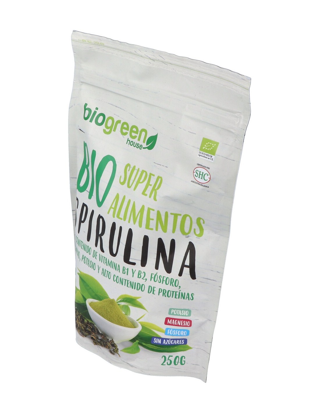 Esta alga de color verde-azulado es rica en triptófano, uno de los 10 aminoácidos esenciales necesarios para el organismo. Además aporta clorofila, varias vitaminas y minerales. Alto contenido de Vitamina B1 y B2, Fósforo, Magnesio, Potasio y Proteínas.BIO SPIRULINA superalimento 250gr. de BIOGREEN