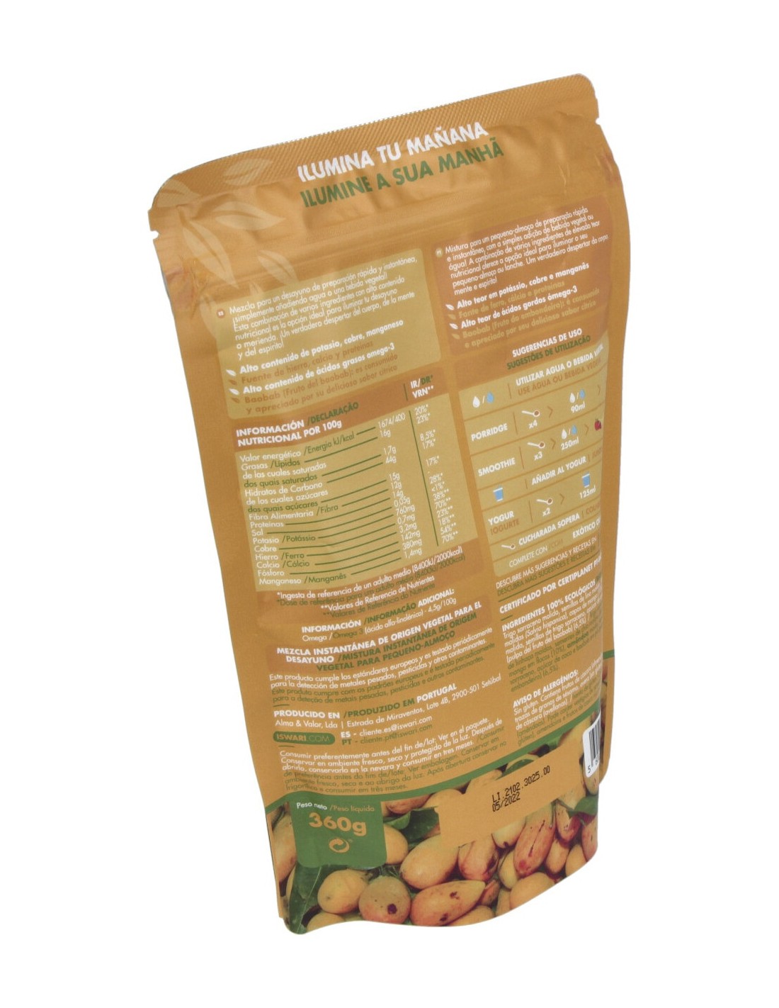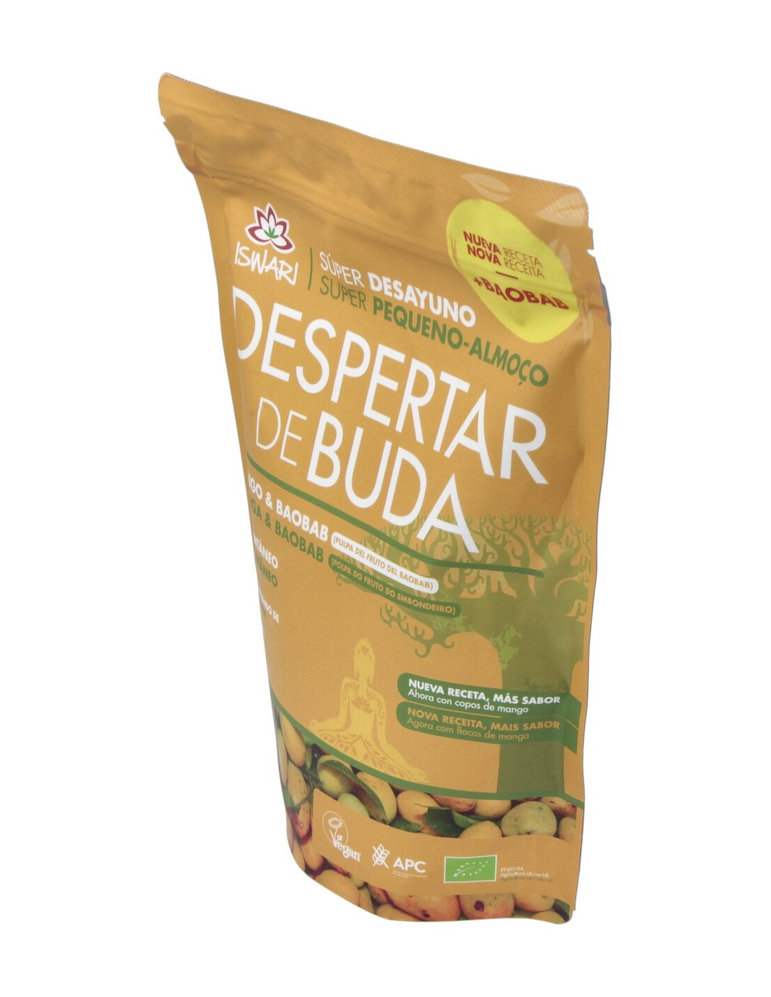 Mezcla para desayuno de despertar de Buda con Mango y Baobab de la marca Iswari, mezcla para un desayuno de preparación rápida e instantánea, simplemente añadiendo agua o una bebida vegetal. Esta combinación de varios ingredientes con alto contenido nutricional es la opción ideal para iluminar tu desayuno o merienda. El perfecto equilibrio entre hidratos de carbono, proteínas, grasas saludables y micronutrientes esenciales. El producto contiene alto contenido de manganeso, magnesio, fósforo, cobre y fibra. Alto contenido de ácidos grasos omega-3. El producto cumple los estándares europeos y es testado periódicamente para la detección de metales pesados, pesticidas y otros contaminantes. El baobab (Fruto del baobab): es consumido y apreciado por su delicioso sabor cítrico. Este producto cumple los estándares europeos y es testado periódicamente para la detección de metales pesados, pesticidas y otros contaminantes. AVISO DE ALERGÉNIOS: Sin gluten. Contiene frutos de cáscara (almendras). Puede contener trazas de granos de sésamo, avena (sin gluten), cacahuetes y de frutos de cáscara (avellanas).
