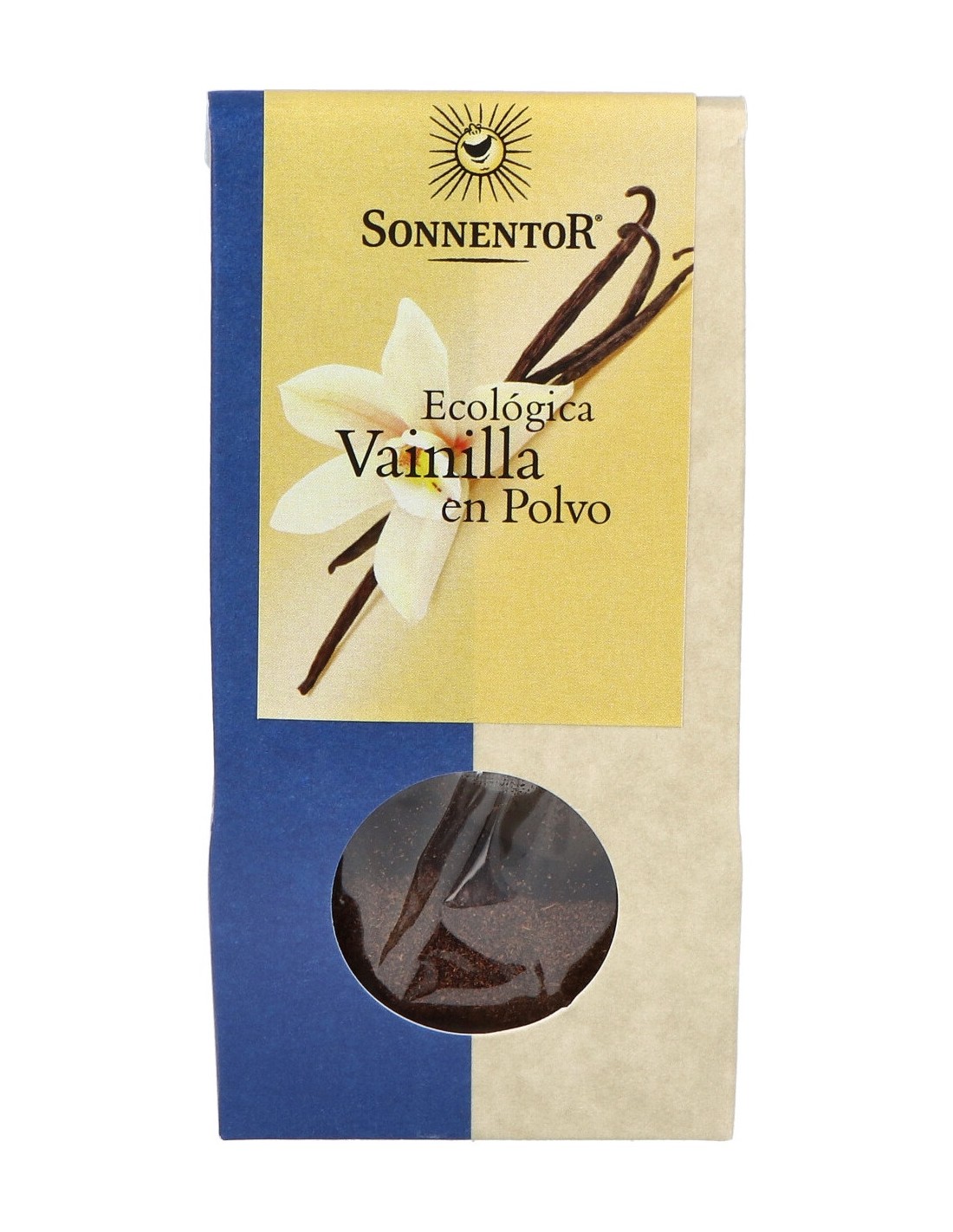 Sonnentor Vainilla en Polvo Bio 10g vainas de vainilla molida, procedentes de la producción ecológica certificada, que está indicada para la elaboración de todo tipo de postres o para la cocina de estilo oriental, aportando un sabor exótico, dulce y cremoso, con toques de regaliz.