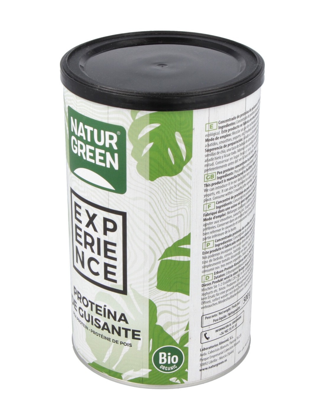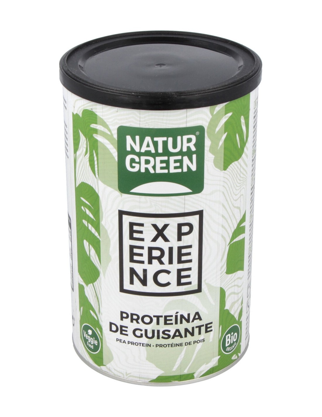 Suplemento dietético de proteína de guisante en polvo. Es un producto bio diseñado por Naturgeen, el cual no contiene huevo, lactosa, gluten, azúcar natural o añadida ni proteína láctea. Contiene un alto contenido de fibra alimentaria, grasas (saturadas y no saturadas) hidratos de carbono, proteínas y sal. Beneficia la salud y el bienestar. Así como a las dietas veganas, las cuales, regularmente, tienen poca cantidad de proteínas. Tiene un sabor suave y color claro, lo cual le permite adaptarse a una gran variedad de batidos y recetas. Se aconseja añadirla a las comidas preferidas para agregarle más nutrientes. No se recomienda en caso de alergia a frutos secos, soja y sésamo, ya que la fábrica que produce este producto trabaja con estos alimentos. Se recomienda almacenar en un ambiente seco y fresco, libre de la humedad o la luz solar.