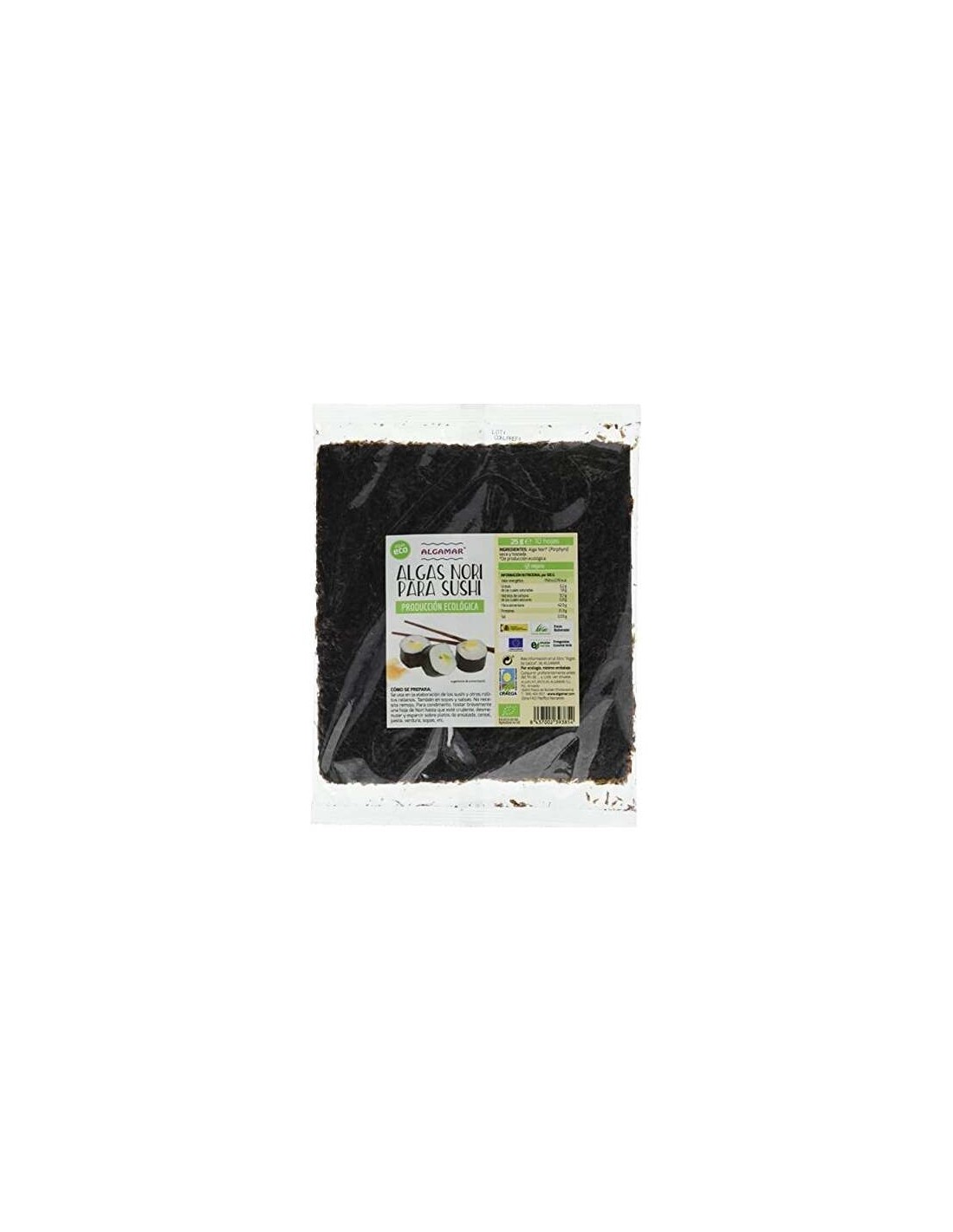 Nori es una de las algas marinas más delicadas y fragantes. Se utiliza tradicionalmente para hacer makis japoneses y sashimi o para envolver rollos de arroz con verduras y / o pescado. También se puede degustar el nori a la plancha y cortado en trozos pequeños como aperitivo.