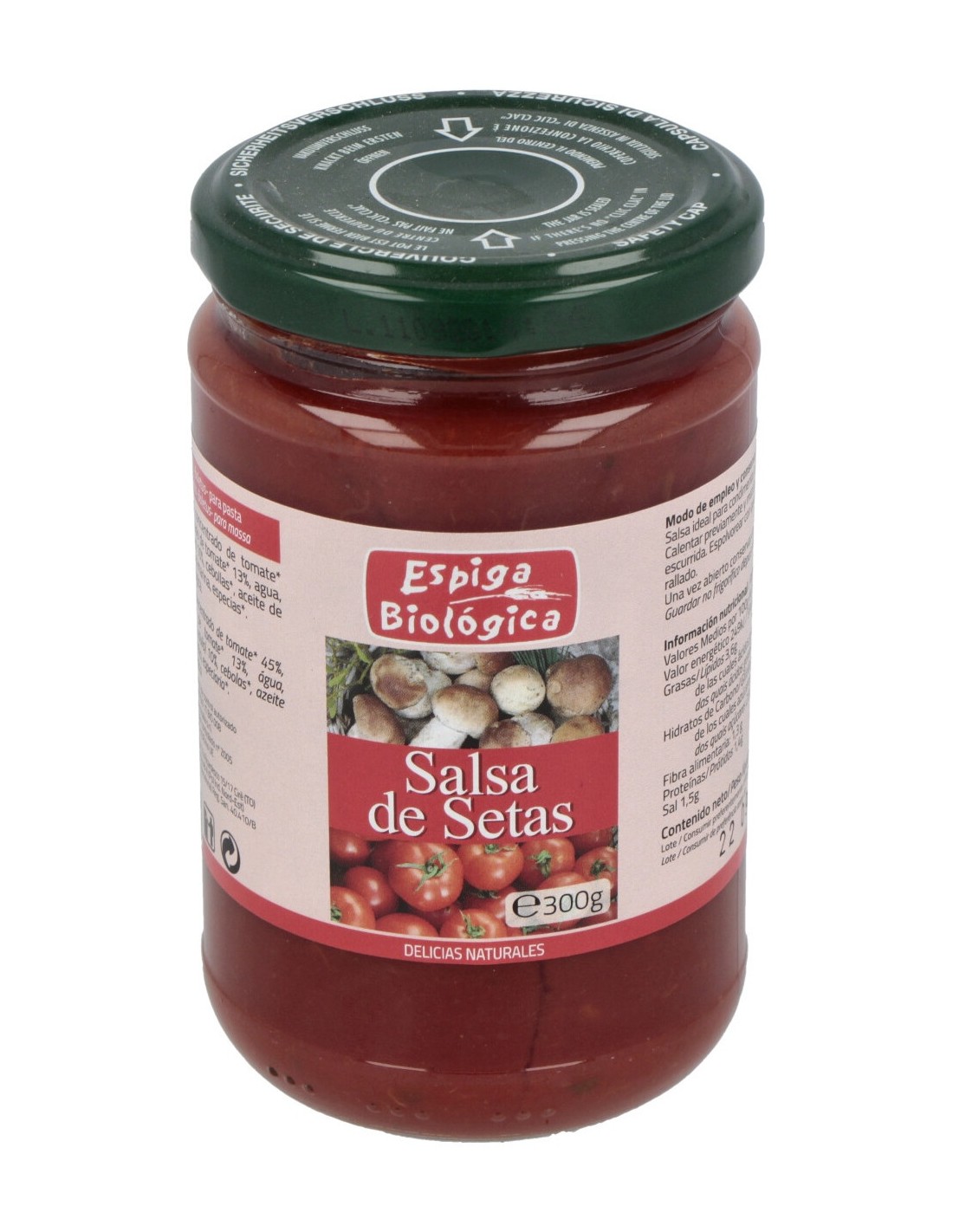 Salsa Setas 100% vegetal y ecológica. En una base de tomate cocinado a baja temperatura, tal como marca la tradición, se le añaden cebolla y setas Boletus edulis, siguiendo la auténtica receta italiana y se aromatiza con albahaca. Sin gluten. Producto vegano.