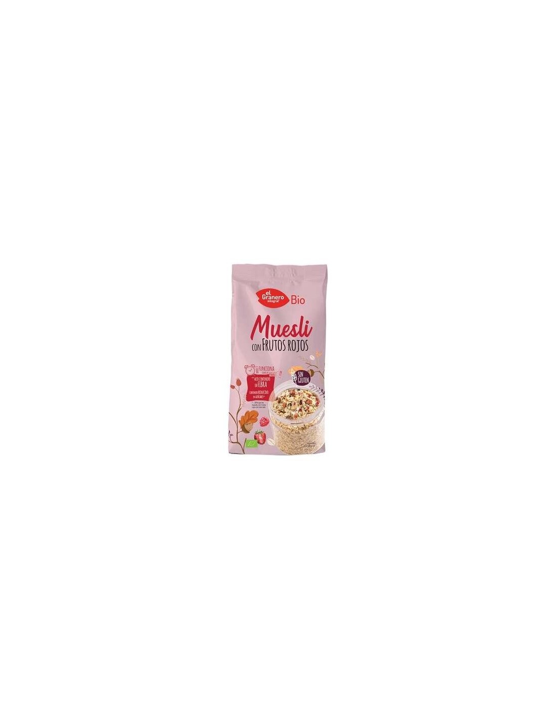 Copos de avena* integral sin gluten 82,6%, copos de arroz* 9% ( arroz*, azúcar de caña* integral, sirope de arroz*, sal marina), pasas* sultanas 7% (pasas* sultanas, aceite de girasol*), frutos rojos* deshidratados congelados en proporción variable 1,4% (arándano rojo* en trozos, arándano azul*, fresa* en trozos, mora* en trozos, frambuesa* en trozos).