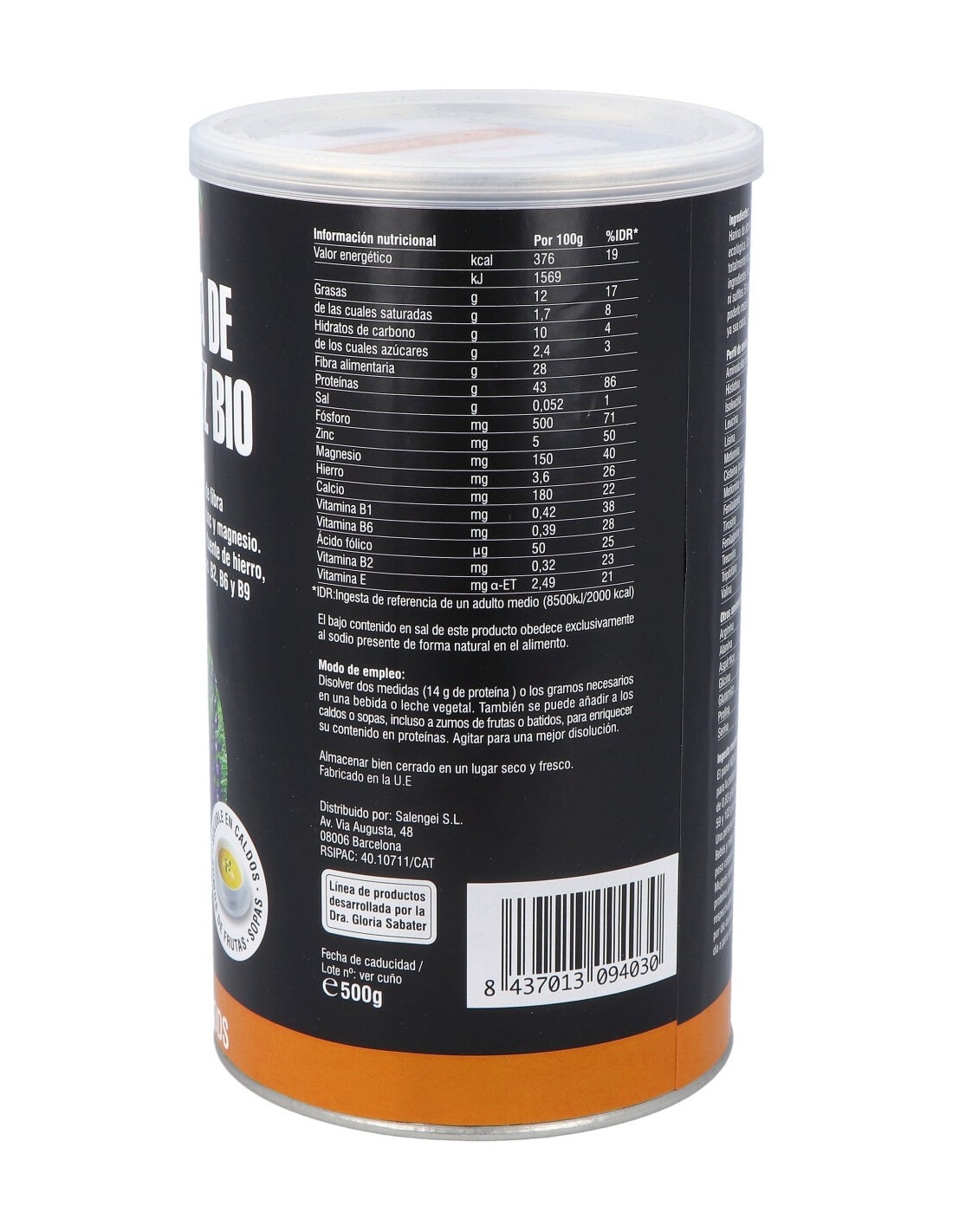 Aporta un 43% de proteína y 28% de fibra. Muy alto contenido en fósforo, zinc y magnesio. Alto contenido en vitamina B1 y fuente de hierro, calcio, vitaminas E, vitaminas B2, B6 y B9.