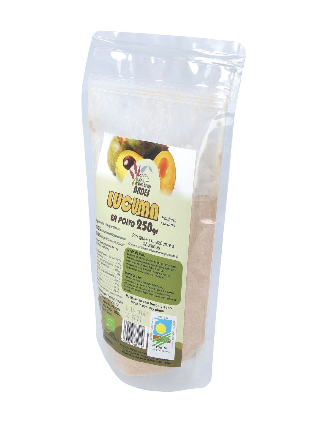 Harina de lúcuma de producción ecológica certificada, indicada para la realización de postres o para mezclar con yogures o cereales. La lúcuma, una fruta nativa del Perú, ofrece un aroma dulce de mango y vainilla, y actúa como un emulsionante. Combina perfectamente con el cacao o chocolate.