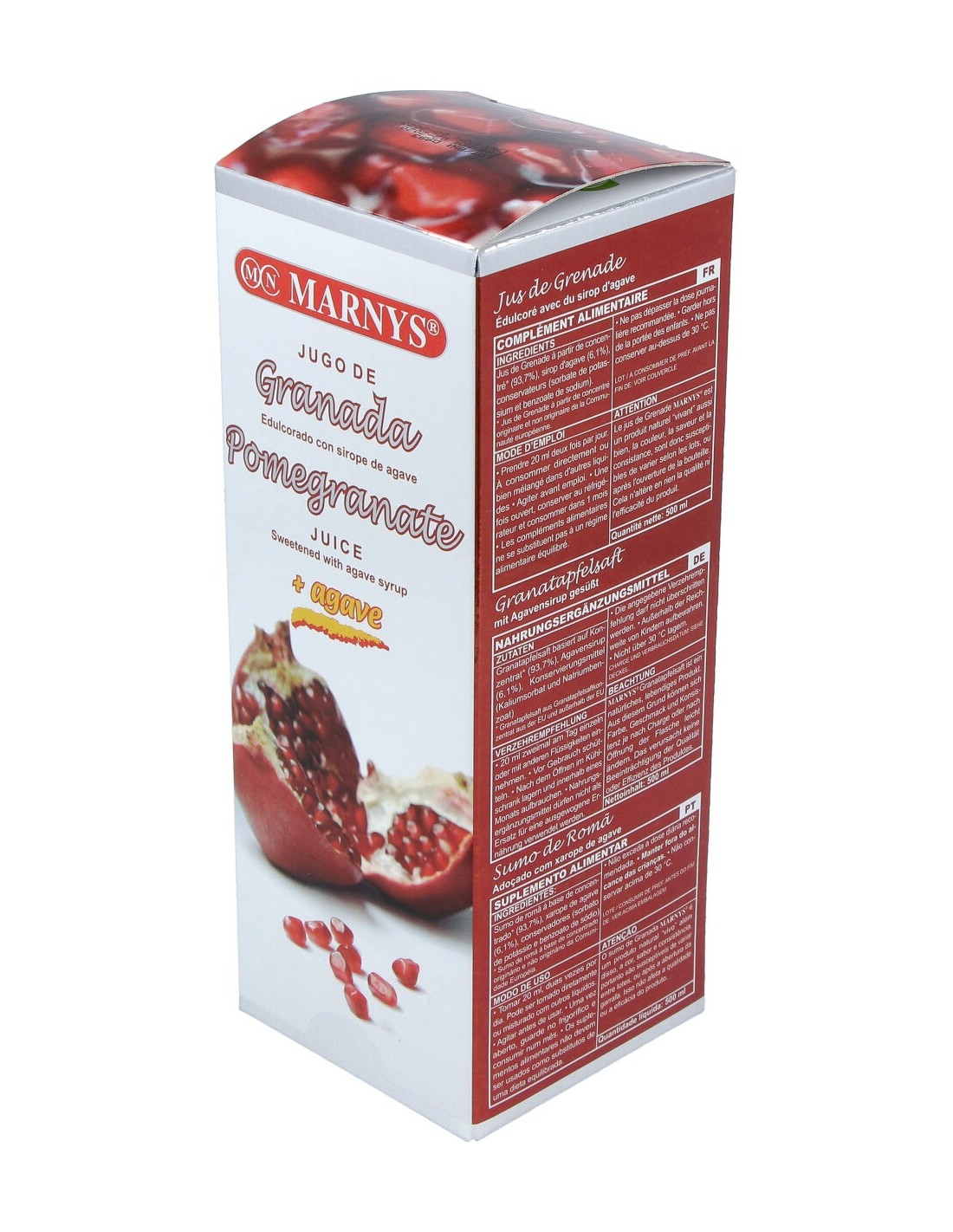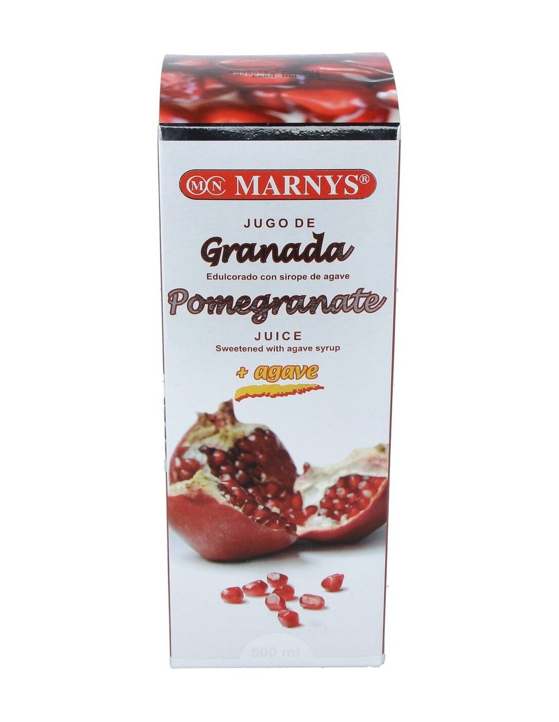 Jugo concentrado de granada, hecho de manera natural y endulzado con sirope de ágave, cuenta con un delicioso sabor natural. Este zumo tiene una gran concentración de flavonoides, antocianidinas, polifenoles, catequinas, taninos, ácidos elágico y gálico, vitaminas A, B y C, potasio, fósforo, magnesio, calcio y sodio. En donde los polifenoles y flavonoides aportan propiedades antioxidantes al cuerpo.