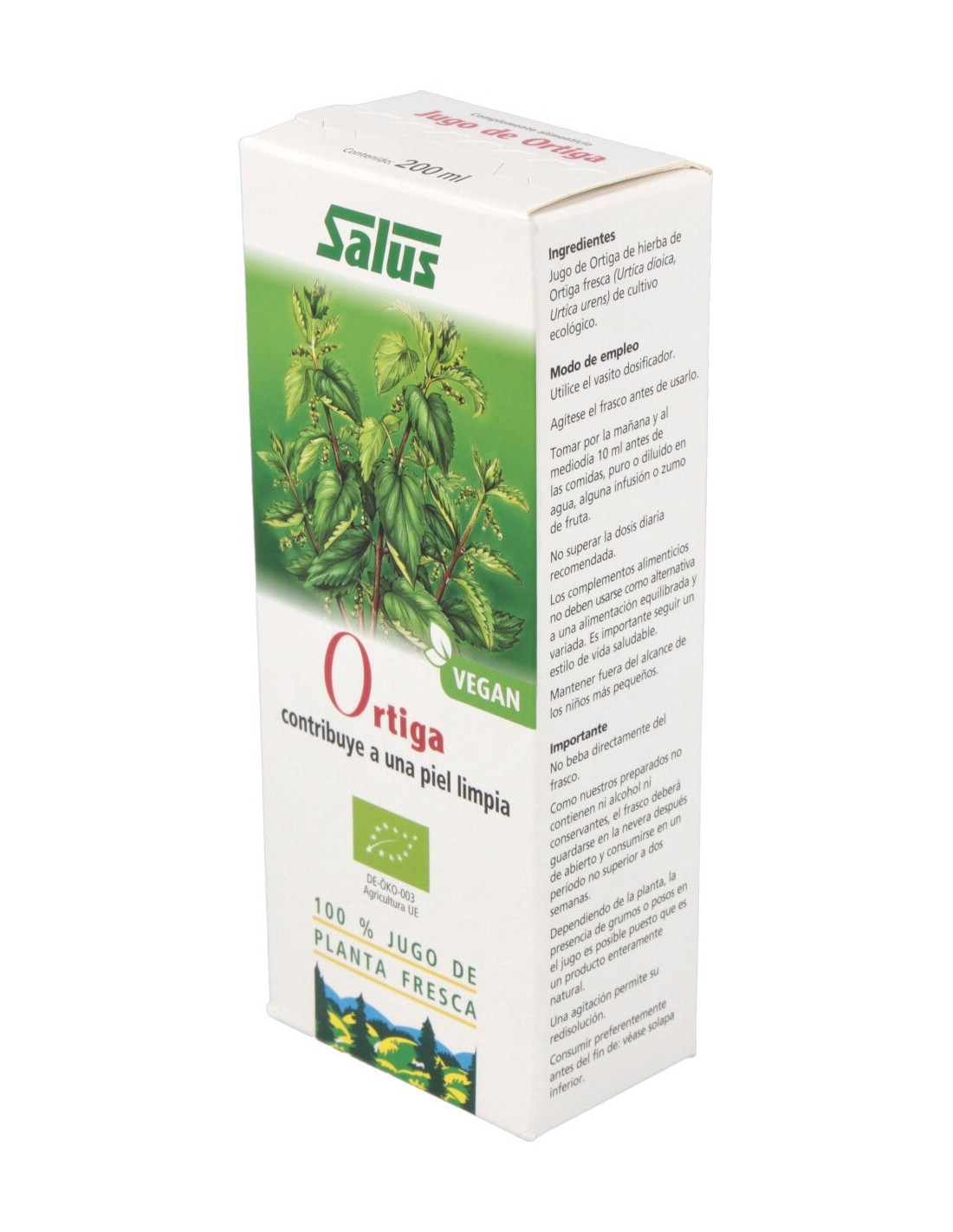 El jugo de ortiga se obtiene por prensado de la planta fresca en su óptimo punto de maduración, por lo que ofrece el espectro completo de principios tal y como se encuentran en la planta fresca, sin alteración alguna.