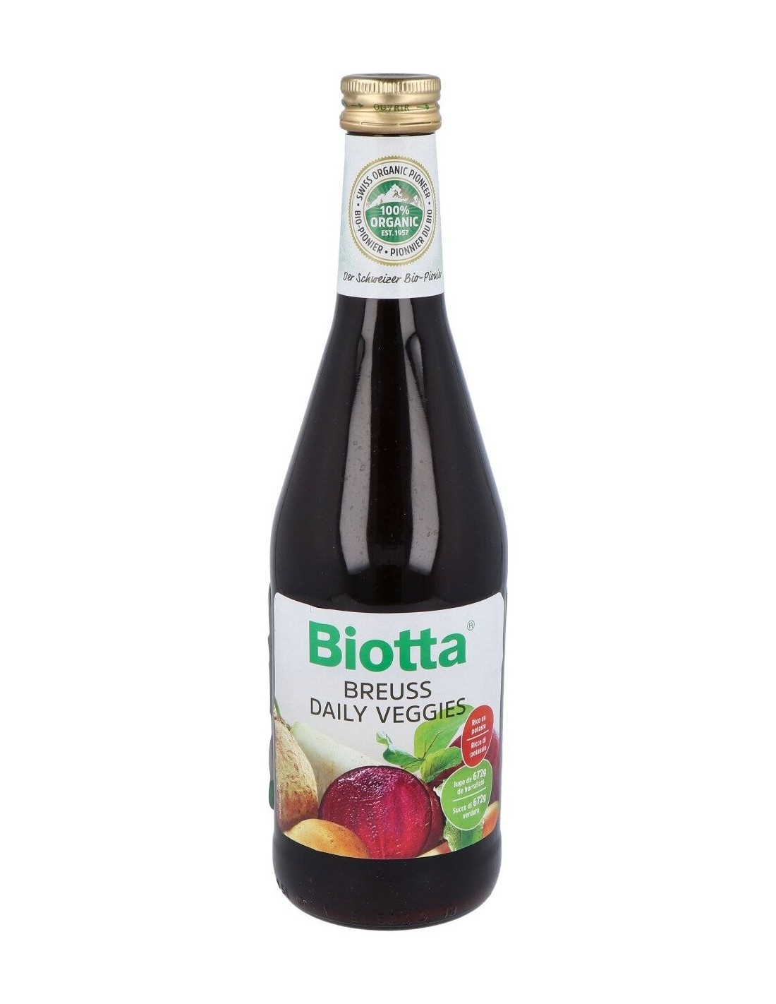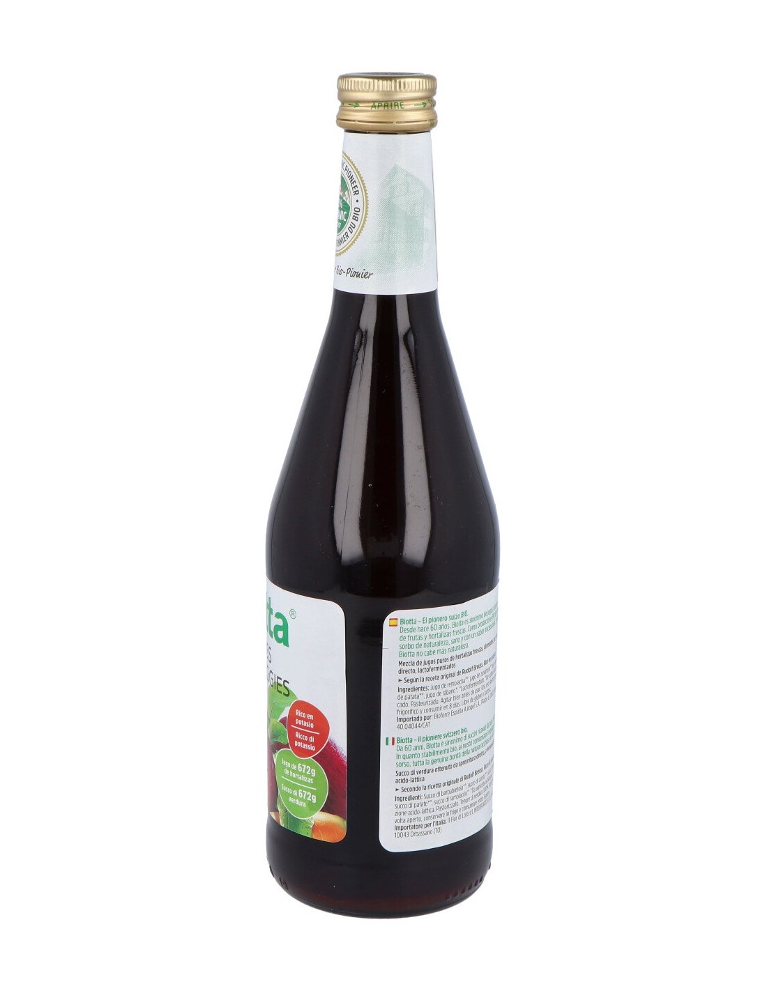 Mezcla de jugos puros de hortalizas obtenidos por prensado directo, lactofermentados. Aporta potasio que contribuye a mantener una tensión arterial normal.