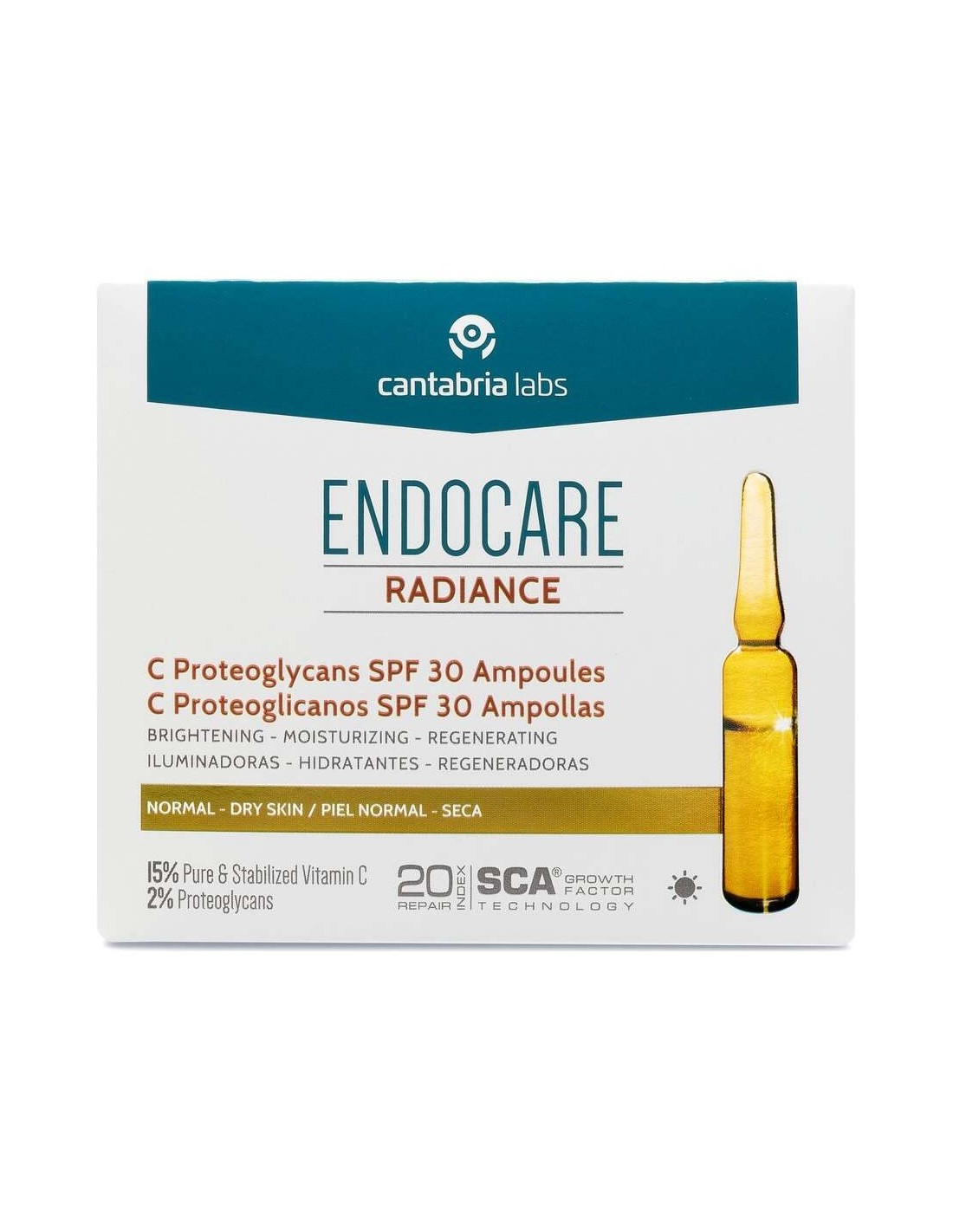 Endocare Radiance C Proteoglicanos SPF30+ 10x2ml son ampollas concentradas que reducen los signos del envejecimiento y previenen su aparición. Textura hidratante ideal para pieles normales o secas. Compuesta con vitamina C, proteoglicanos y filtros uvb-uva para una acción antioxidante, regeneradora, protectora e hidratante que aporta un efecto de luminosidad a la piel. Indicada para el tratamiento y prevención de los signos del fotoenvejecimiento de pieles normales a secas con SPF30.