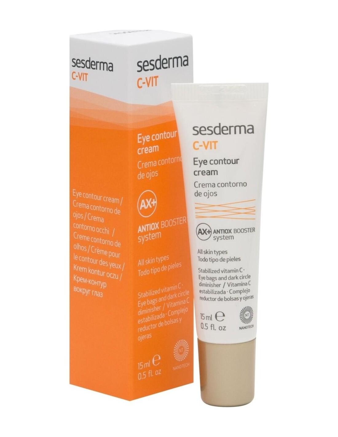 Está crema contiene vitamina c que actúa como un nutriente proporcionando un efecto anti radicales libres y antioxidante. Además posee silicio orgánico y elementos que forman parte de su """"antiox Booster system ax"""" qué ayudan a reducir las bolsas de los ojos.