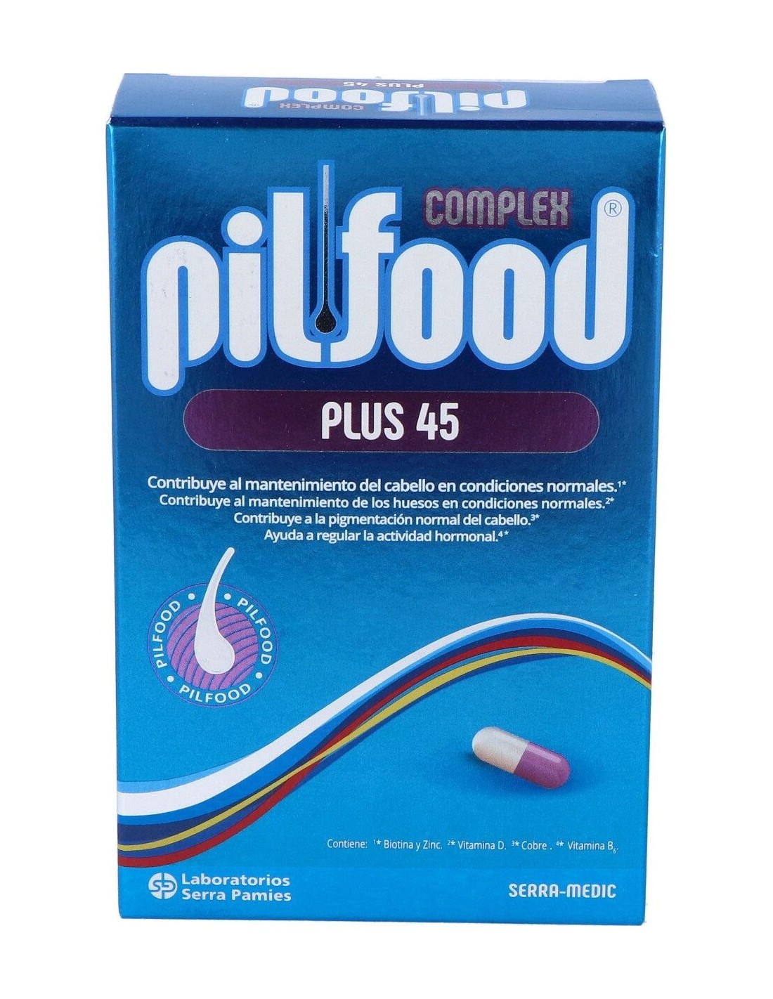 L-cistina, Gelatina, Extracto de mijo (Panicum miliaceum), L-metionina, Desintegrante (Crocarmelosa sódica), Hierro (Sulfato), Deslizante (Silice coloidal anhidra), Zinc (Óxido), Alfa-tocoferol acetato, Pantotenato cálcico, Diluyente (Celulosa microcristalina), Lubricante y agente de recubrimiento (Estearato de magnesio), Piridoxina (Clorhidrato), Manganeso (Sulfato), Ácido gamma-linolénico, Riboflavina (Fosfato sódico), Cobre (Sulfato), Colecalciferol, Biotina, Colorantes: Allura red (E-129), Brilliant blue (E-133), Candurin Silver fine (E-555).