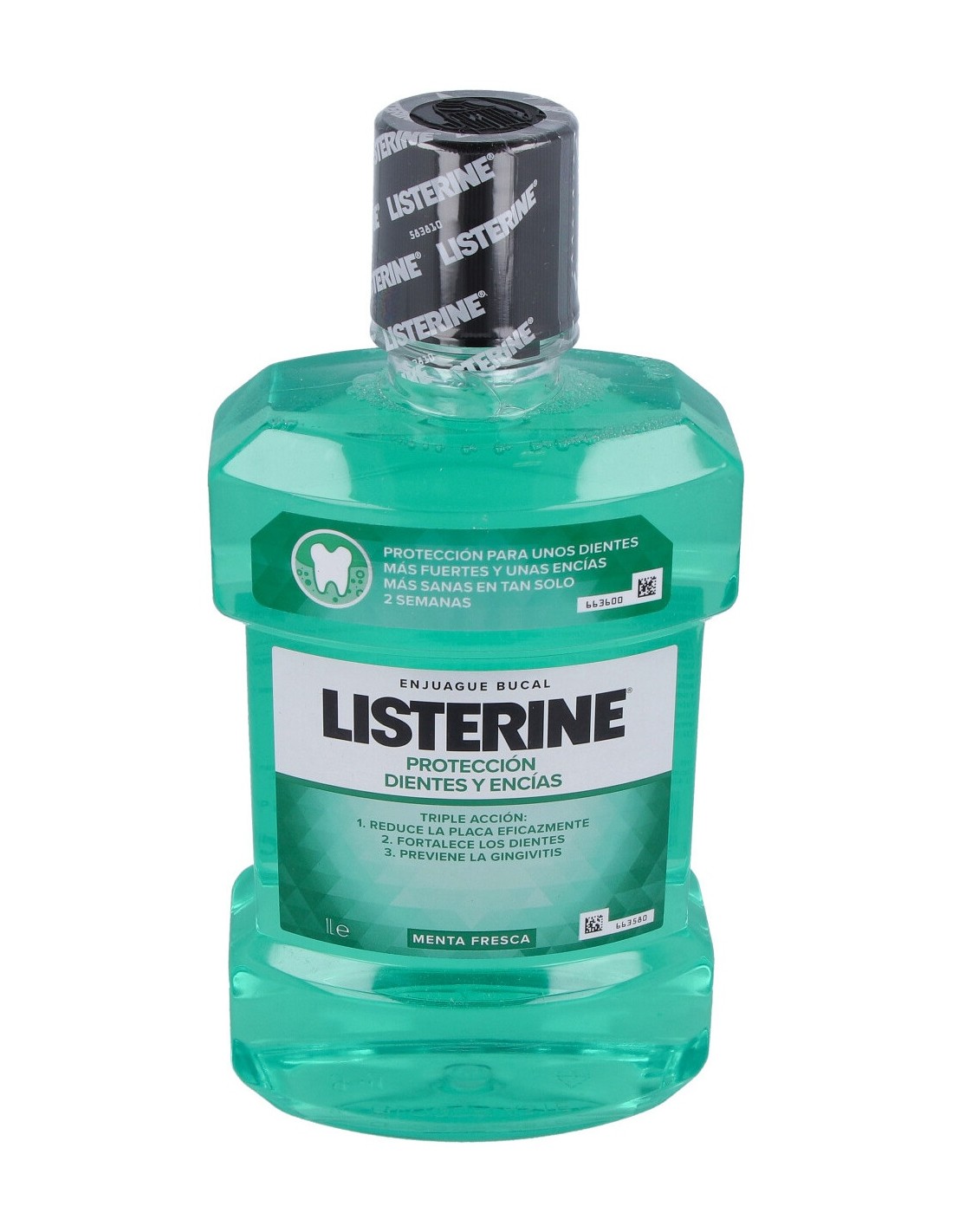 INCI: Aqua, Alcohol, Sorbitol, Poloxamer 407, Benzoic Acid, Sodium Saccharin, Eucalyptol, Methyl Salicylate, Aroma, Thymol, Sodium Fluoride, Menthol, Sodium Benzoate, CI 47005, CI 42053. Contiene Fluoruro de Sodio (220 ppm de flúor)