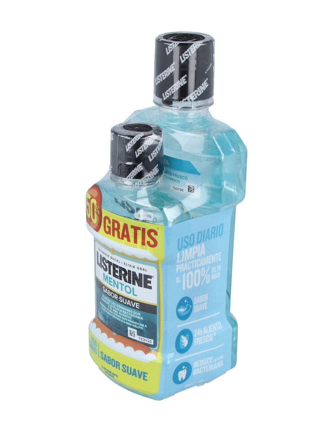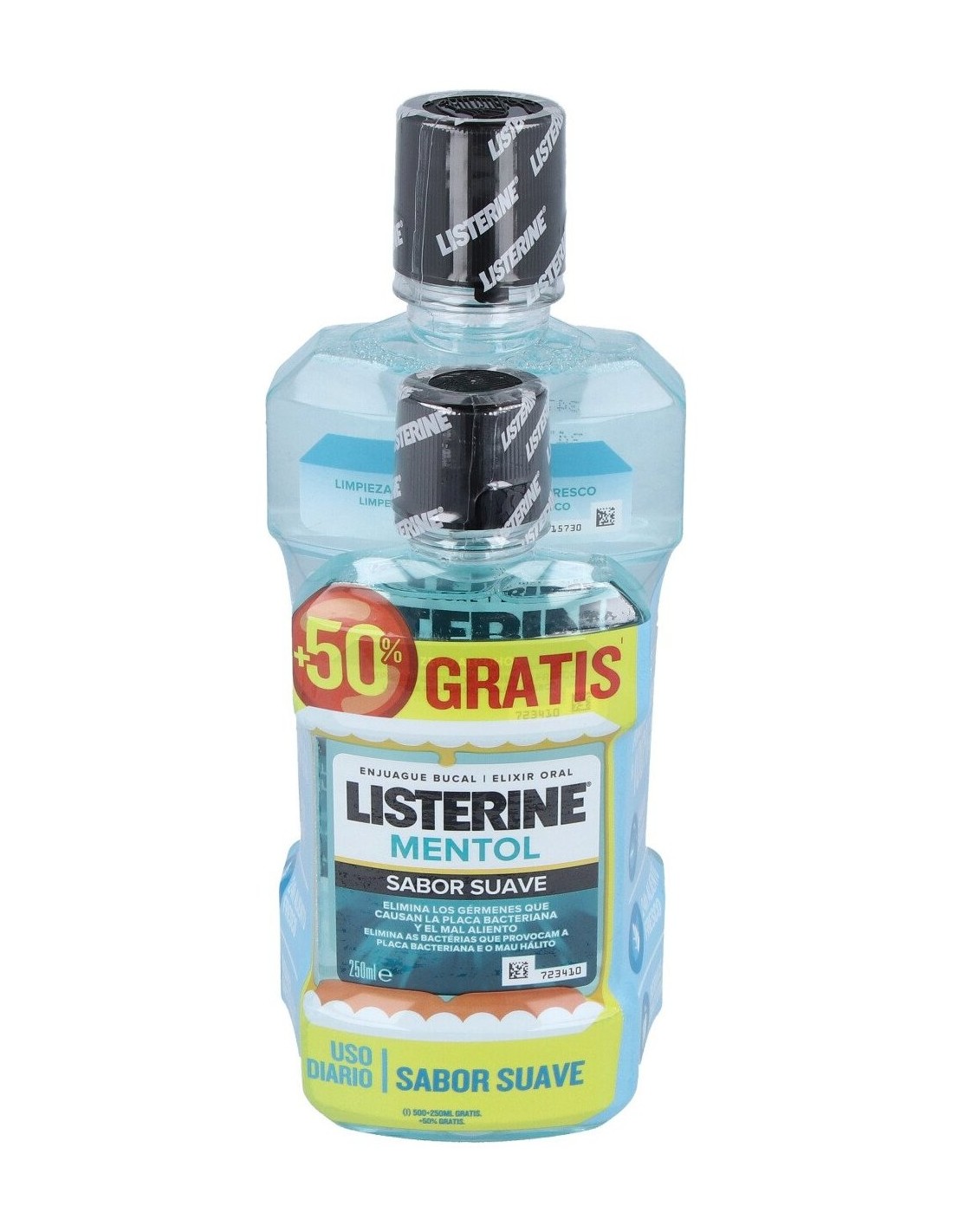 Listerine Mentol Sabor Suave 500+250ml es un colutorio para después del cepillado que favorece una higiene bucal profunda, ya que llega a aquellas zonas donde el cepillo de dientes no alcanza.