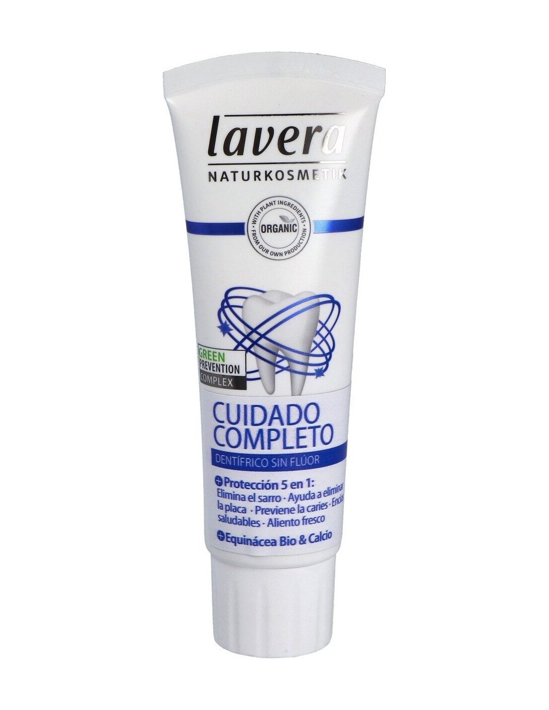 Dentífrico para el cuidado completo de la boca. Su fórmula con equinácea procedente de agricultura orgánica y calcio, ofrece una protección completa para dientes y encías al ayudar a eliminar la placa bacteriana y a evitar su formación, protegiendo contra la caries y ayudando a prevenir la formación de sarro, cuidando las encías y dejando un aliento fresco. Su composición sin flúor es adecuada para niños.