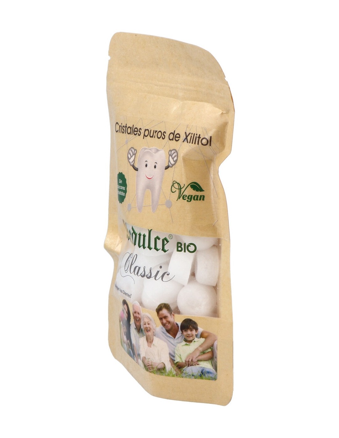 Caramelo que se disuelve lentamente aumentando el pH de la boca (alcalino). Interfiere en la acción de las bacterias dañinas que están en la boca y que producen ácido láctico, estropeando los dientes, esto evita que aparezcan las caries. La saliva se impregna con el fosfato de calcio y apoya la remineralización de los dientes y huesos.