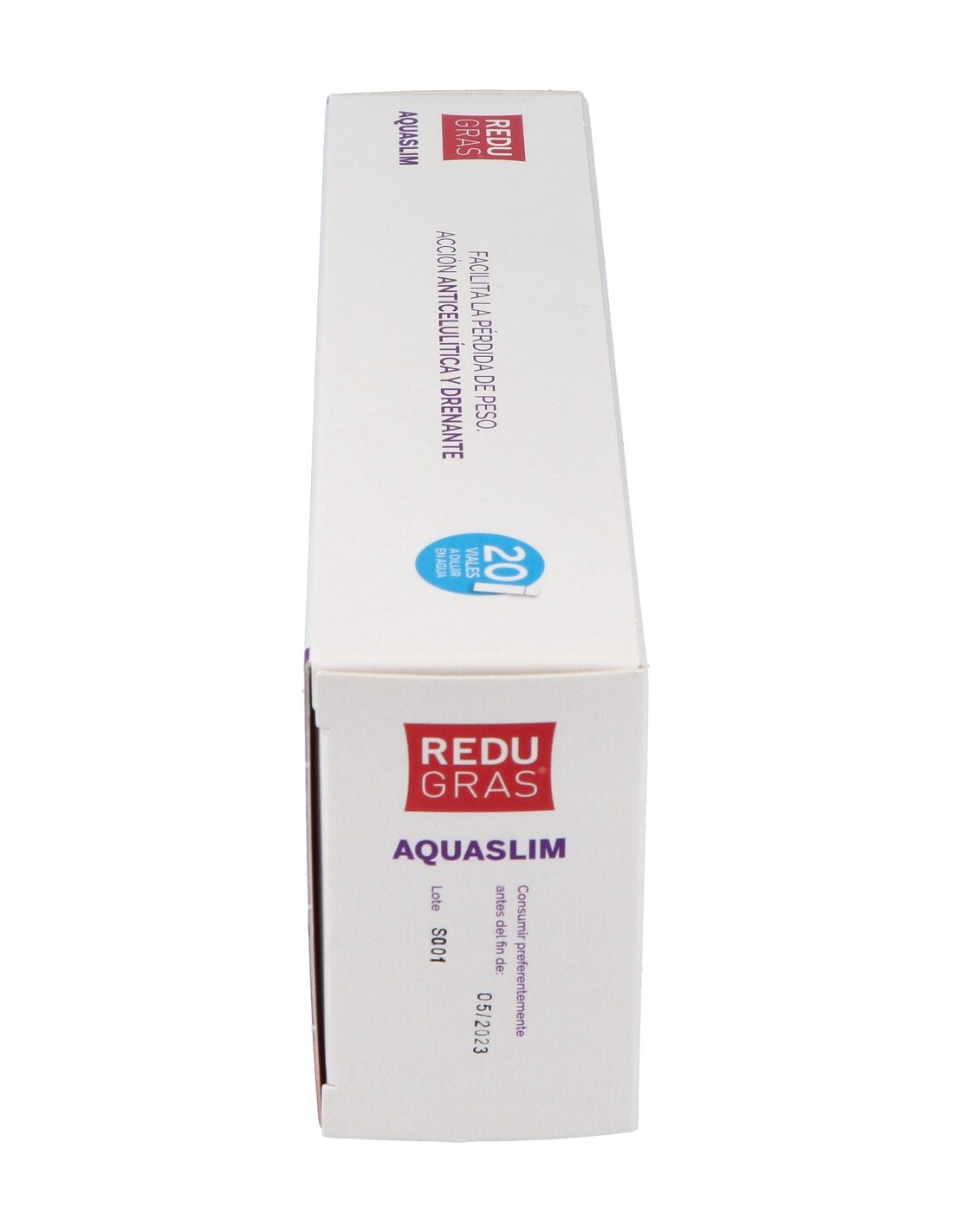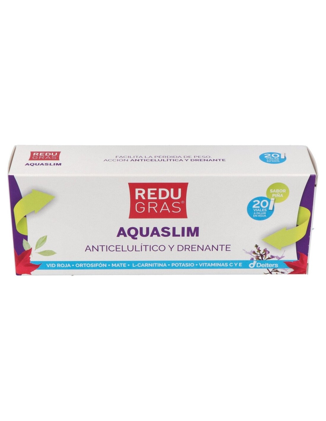 Redugras® Aquaslim ayuda a combatir la retención de líquidos y facilita la circulación sanguínea. Gracias a su formulación rica en vid roja, ortosifón, rusco, mate, L-carnitina, vitaminas C y E y potasio, este complemento alimenticio tiene una potente acción como drenante y anticelulítico.