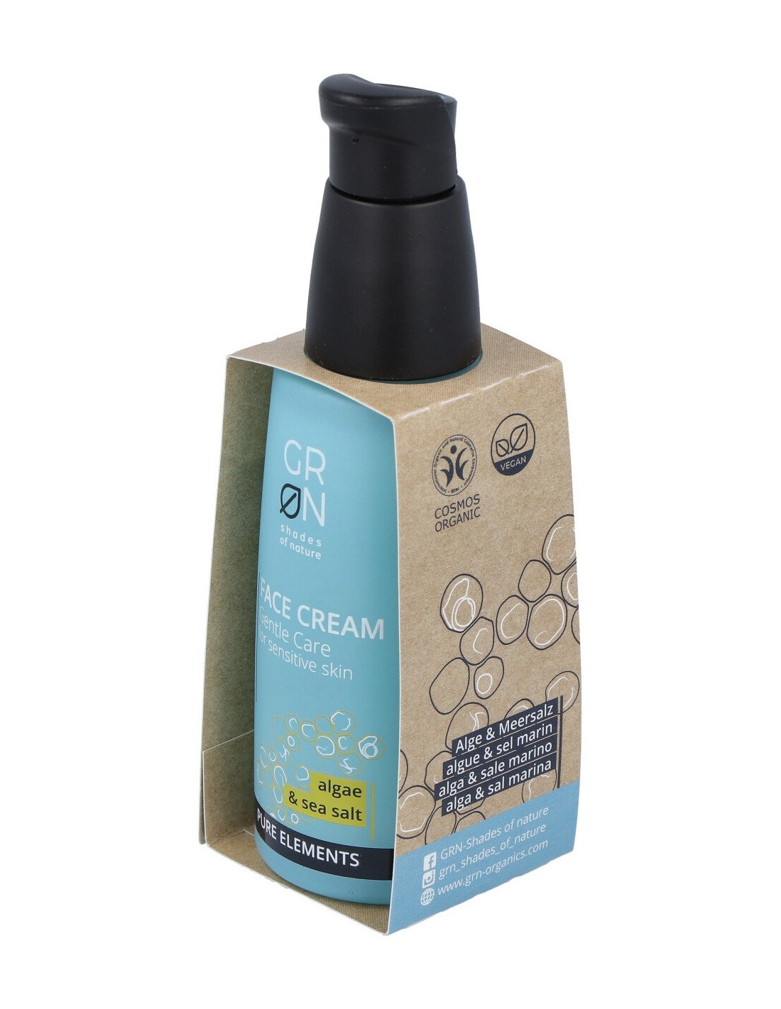 Crema ligera con extracto de alga Chlorella y sal marina mima la piel sensible con su textura re-hidratante que la protege de las agresiones externas, contiene manteca de Karité y aceite de almendras, ideal para el uso del día a día. Se puede usar como base para el maquillaje. Fórmula con PH neutro y vegana. Producto certificado Cosmos Organic.