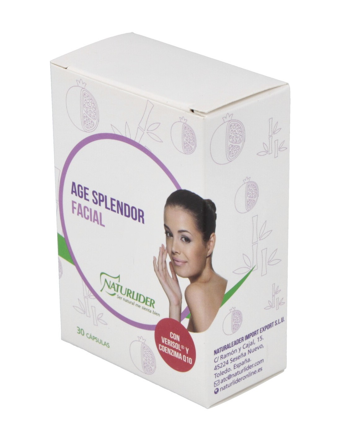 Naturlider Age Splendor Facial 30 cápsulas Vegetales funciona como complemento alimenticio que beneficia la salud de la piel, ya que le brinda flexibilidad y refuerza la estructura interna del cutis.