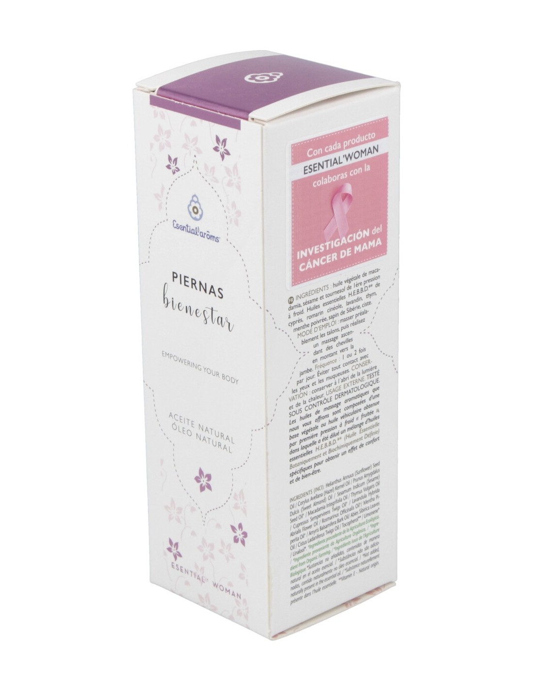 Ayuda a tonificar el sistema venoso, y favorecer un buen descanso para las piernas pesadas. Apto para veganos.PIERNAS BIENESTAR 50ml. ESENTIAL WOMAN de ESENTIAL AROMS