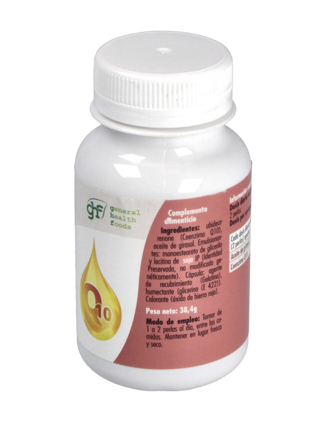 Coenzima Q10 30 mg, aceite de soja (NO GMO) 490 mg. Cobertura de gelatina y glicerina.