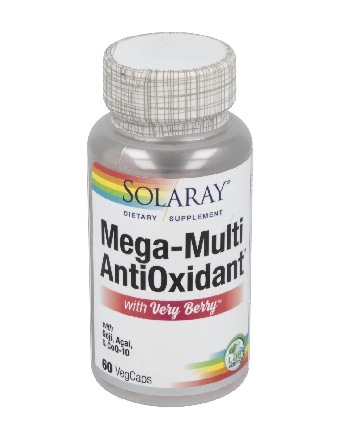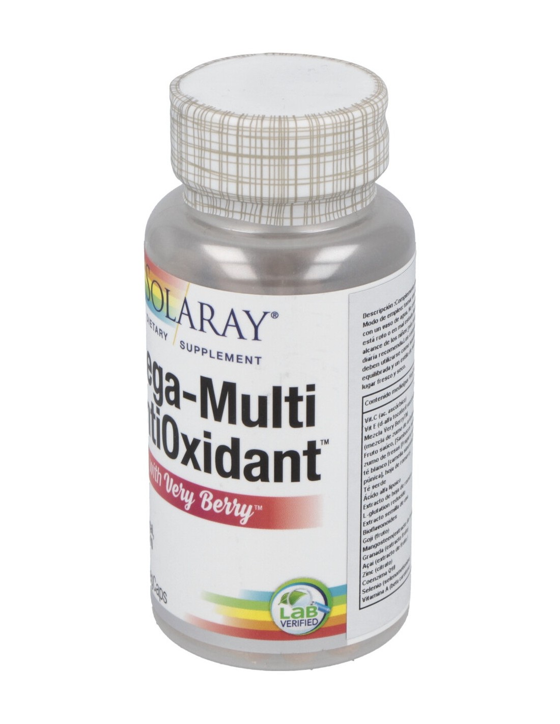 Solaray Mega Antioxidante Very Berry es un complemento alimenticio rico en antioxidantes gracias a su fórmula con base de bayas goji, açaí, mangosteen, granada, arándanos, saúco, moras, frambuesas, fresas y reforzado con té blanco, manzana y romero.