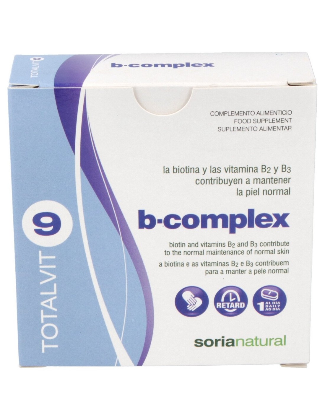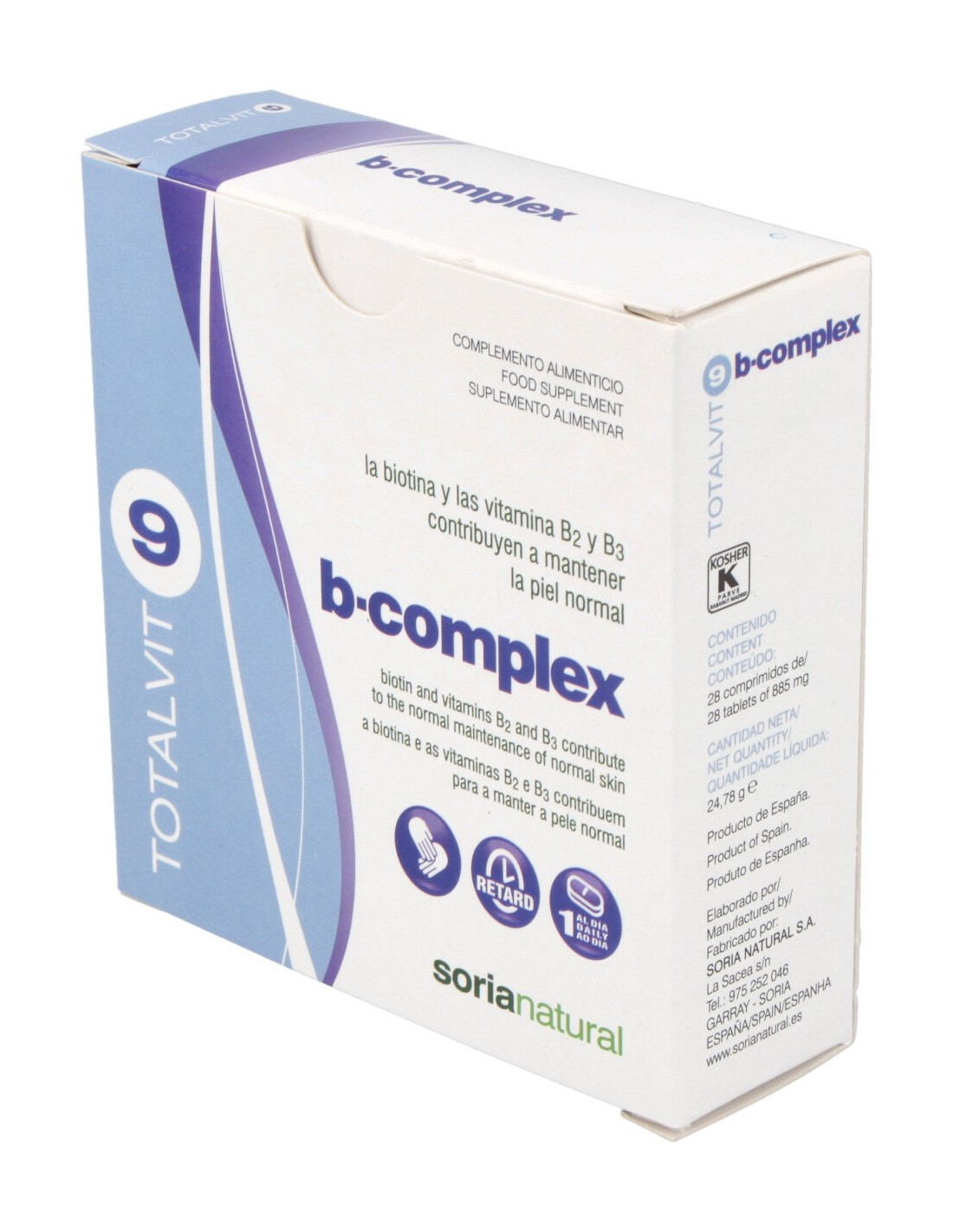 Soria Natural Totalvit 09 B-Complex 28comp son unos comprimidos a base de una gran combinación de vitaminas hidrosolubles del complejo B, necesarias para un correcto mantenimiento de la funciones fisiológicas del organismo.