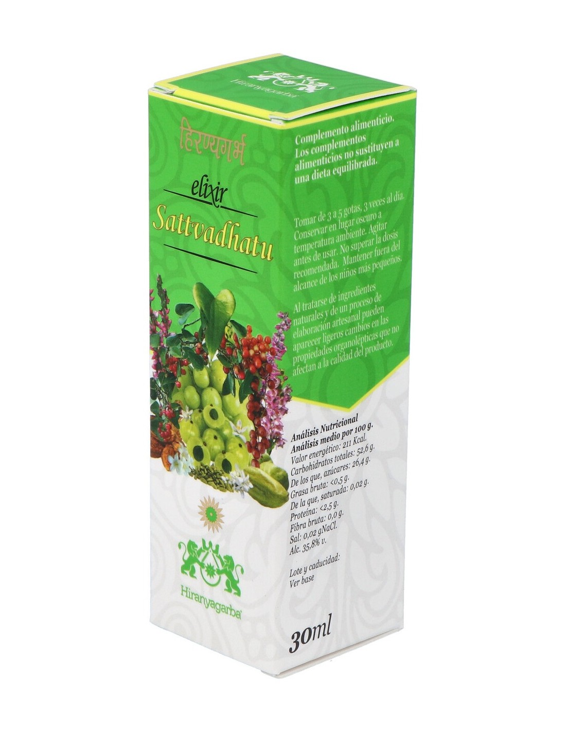 Agua: fructosa: alcohol etílico: concentrado de zarzaparrilla (Smilax aspera): miel de brezo (Erica arborea): extracto de ampalayá (Momordica charantia): concentrado de triphala [amalaki (Emblica officinalis), bibhitaki (Terminalia bellerica) y haritaki (Terminalia chebula)]: golden elixir [agua, alcohol etílico, fructosa, carbonato de potasio y esencias de naranja amarga (Citrus aurantium), limón (Citrus limonum), mandarina (Citrus nobilis), anís (Pimpinella anisum), cardamomo (Elettaria cardamomum), clavo (Syzygium aromaticum), jengibre (Zingiber officinale), pimienta negra (Piper nigrum) y cúrcuma (Curcuma longa)]: citrato de magnesio.