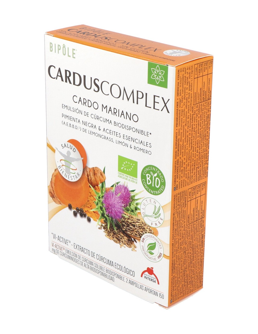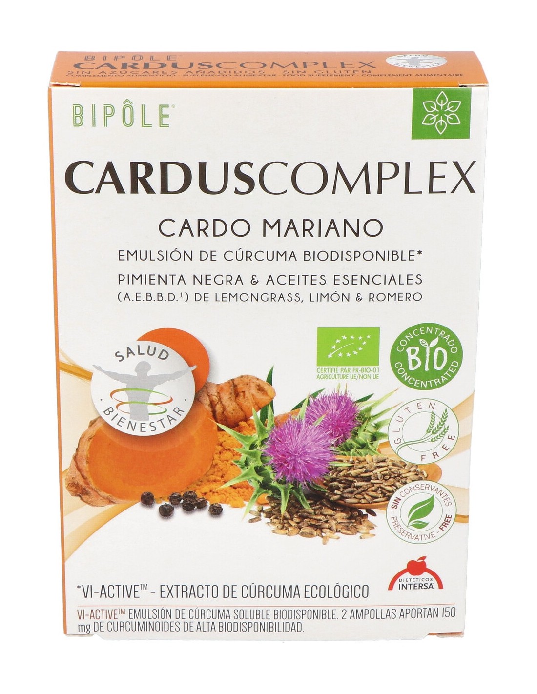 Agua: jugo concentrado de naranja*: Vi-ActiveTM - extracto de cúrcuma BIO [emulsión de rizoma de cúrcuma* (Curcuma longa L.), 14,6% curcuminoides]: extracto seco de semilla de cardo mariano* [Silybum marianum (L.) Gaertn., 3% silimarina], de semillas de pimienta negra* (Piper nigrum L., 10% en piperina): aroma natural de menta*: aceite esencial de romero verbenona*(Rosmarinus officinalis L.) 10 mg/amp., de corteza de limón* [Citrus limonum (L.) Osbeck] 10 mg/amp. y de lemongrass* (Cymbopogon citratus L.) 1 mg/amp.