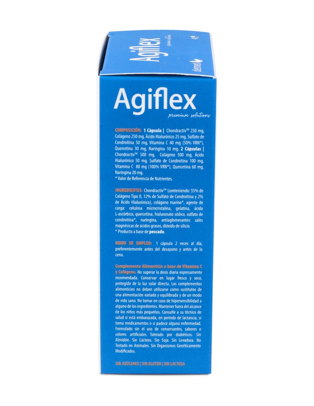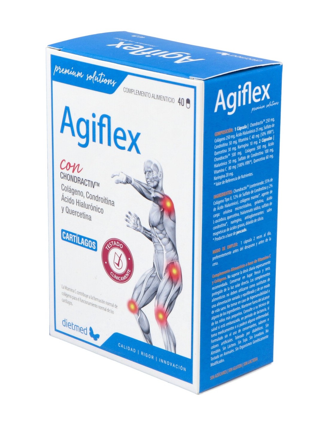 ChondractivTM (conteniendo 55% de Colágeno Tipo II, 12% de Sulfato de Condroitina y 2% de Ácido Hialurónico), agente de carga: celulosa microcristalina, colágeno marino, gelatina, ácido L-ascórbico, quercetina, hialuronato de sodio, sulfato de condroitina, naringina, antiaglomerantes: estearato de magnesio, dióxido de silicio.
