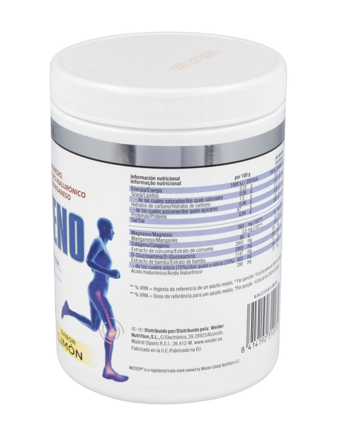 89% COLÁGENO BOVINO HIDROLIZADO (PEPTAN®), EXTRACTO DE CÚRCUMA (CURSOLTM) """"CURCUMA LONGA L."""", GLUCOSAMINA HCL, ACIDULANTE: ÁCIDO CÍTRICO; EXTRACTO DE BAMBÚ """"BAMBUSA BAMBOSS (L.) VOSS"""", AROMA (AROMA DE LIMÓN), ÁCIDO HIALURÓNICO, EDULCORANTES: SUCRALOSA, GLUCÓSIDOS DE ESTEVIOL; GLUCONATO DE MANGANESO.
