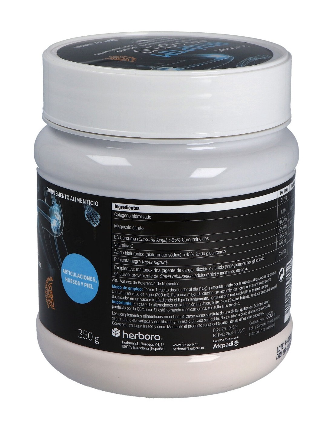 Colágeno hidrolizado en polvo junto a otros ingredientes como: magnesio, ácido hialurónico, cúrcuma, vitamina C y pimienta negra. Con agradable sabor a naranja y sin edulcorantes artificiales.
