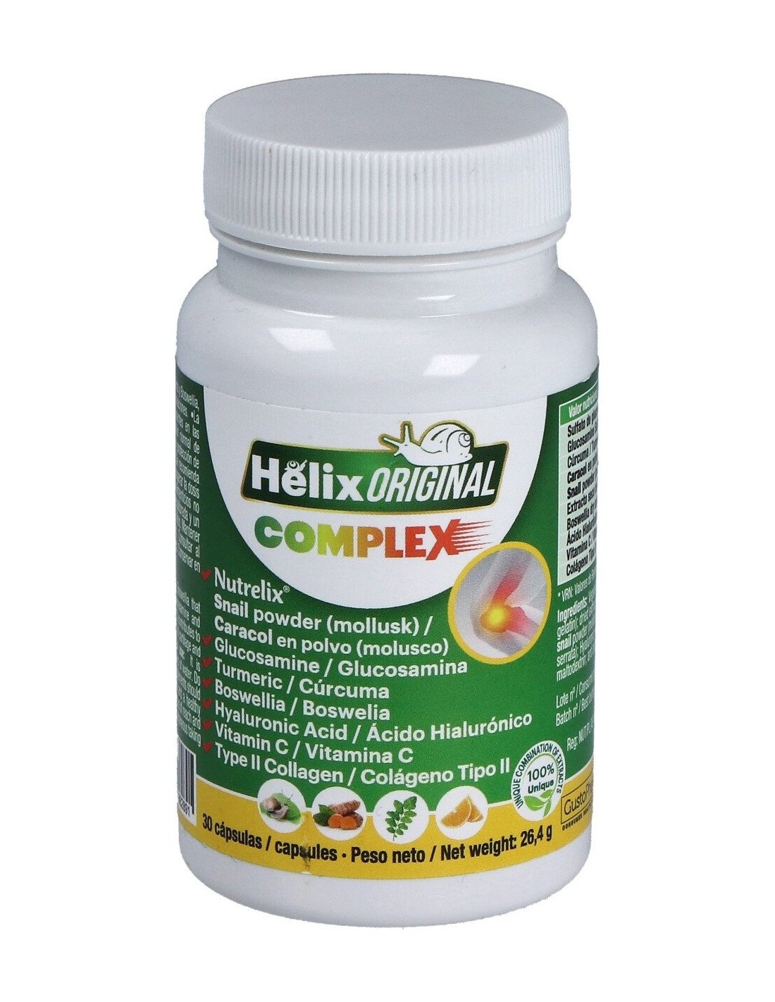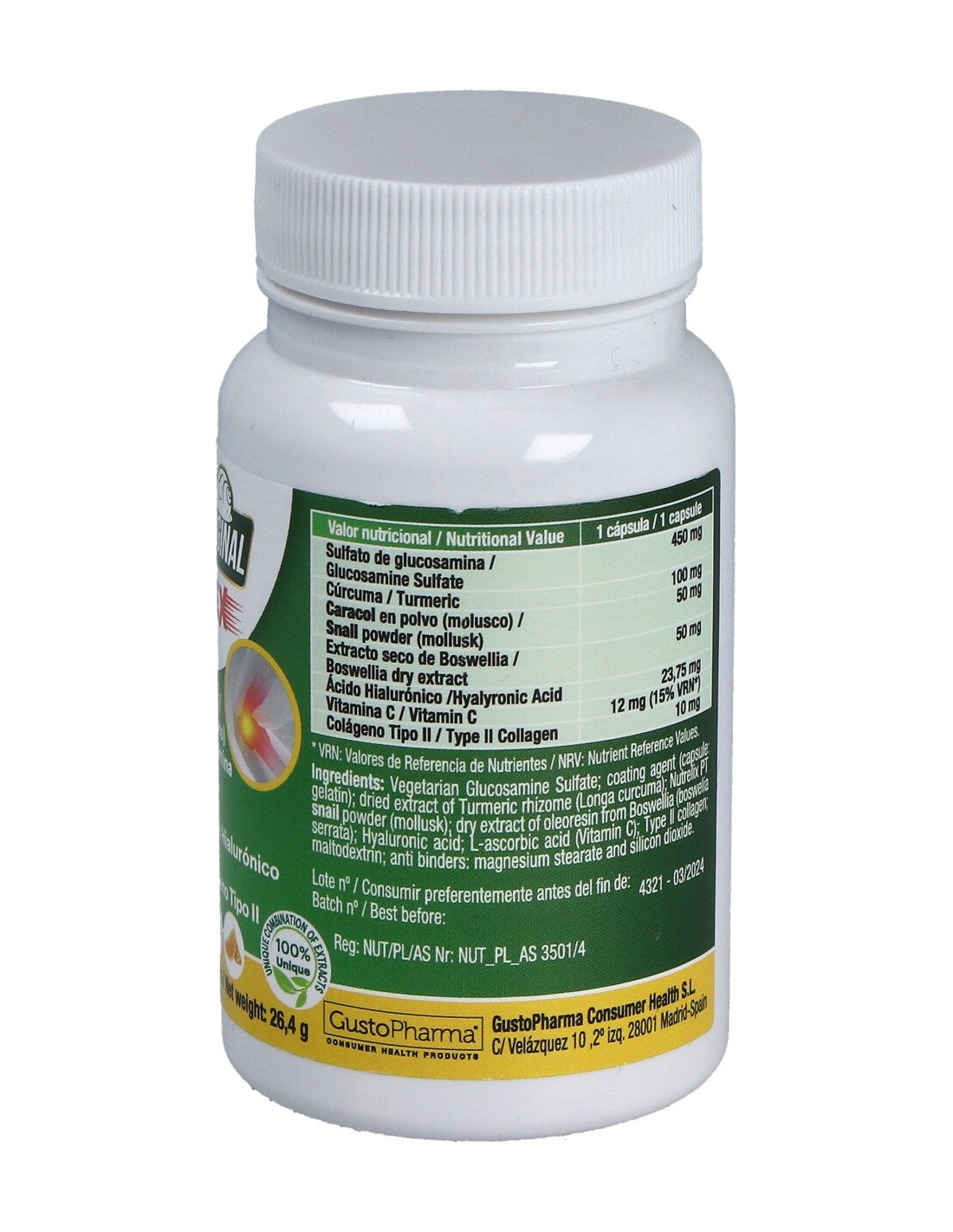 Sulfato de Glucosamina vegetariano: agente de recubrimiento (cápsula: gelatina): extracto seco de rizoma de Cúrcuma (curcuma Longa): Nutrelix PT caracol en polvo (molusco): extracto seco de oleorresina de Boswelia (boswelia serrata): Ácido hialurónico: ácido L-ascórbico (Vitamina C): Colageno tipo II: agente de carga: maltodextrina: anti aglomerantes: estearato de magnesio y dióxido de sicilio.