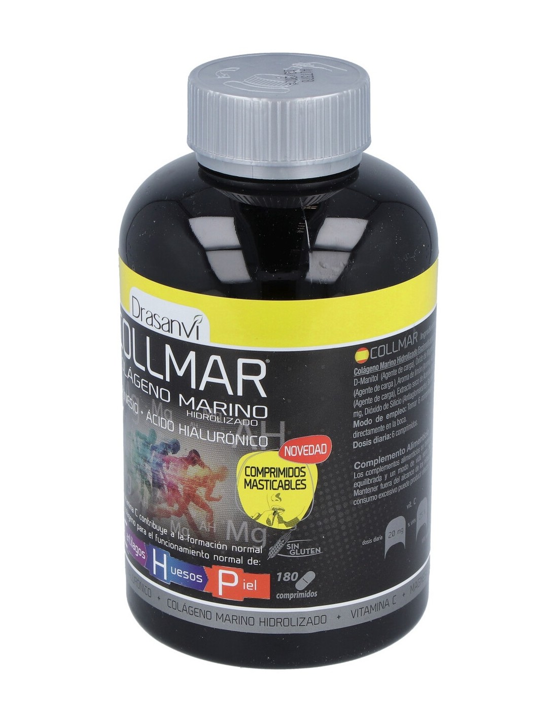 colágeno marino hidrolizado enzimáticamente ( contiene pescado tipo I, muy bajo peso molecular) 3.900mg, agente de carga d-manitol, óxido de magnesio (magnesio 40%) 562,5 mg, agente de carga (almidón de maíz ), aroma (aroma natural de limón), acidulante (ácido cítrico), agente de carga (estearato de magnesio), extracto seco de acerola (malpighia prunicifolia al 25% en vitamina c) 80mg, antiaglomerante (dióxido de silicio), edulcorante (sucralosa), ácido hialurónico 10,02mg.Alérgenos: contiene pescado.