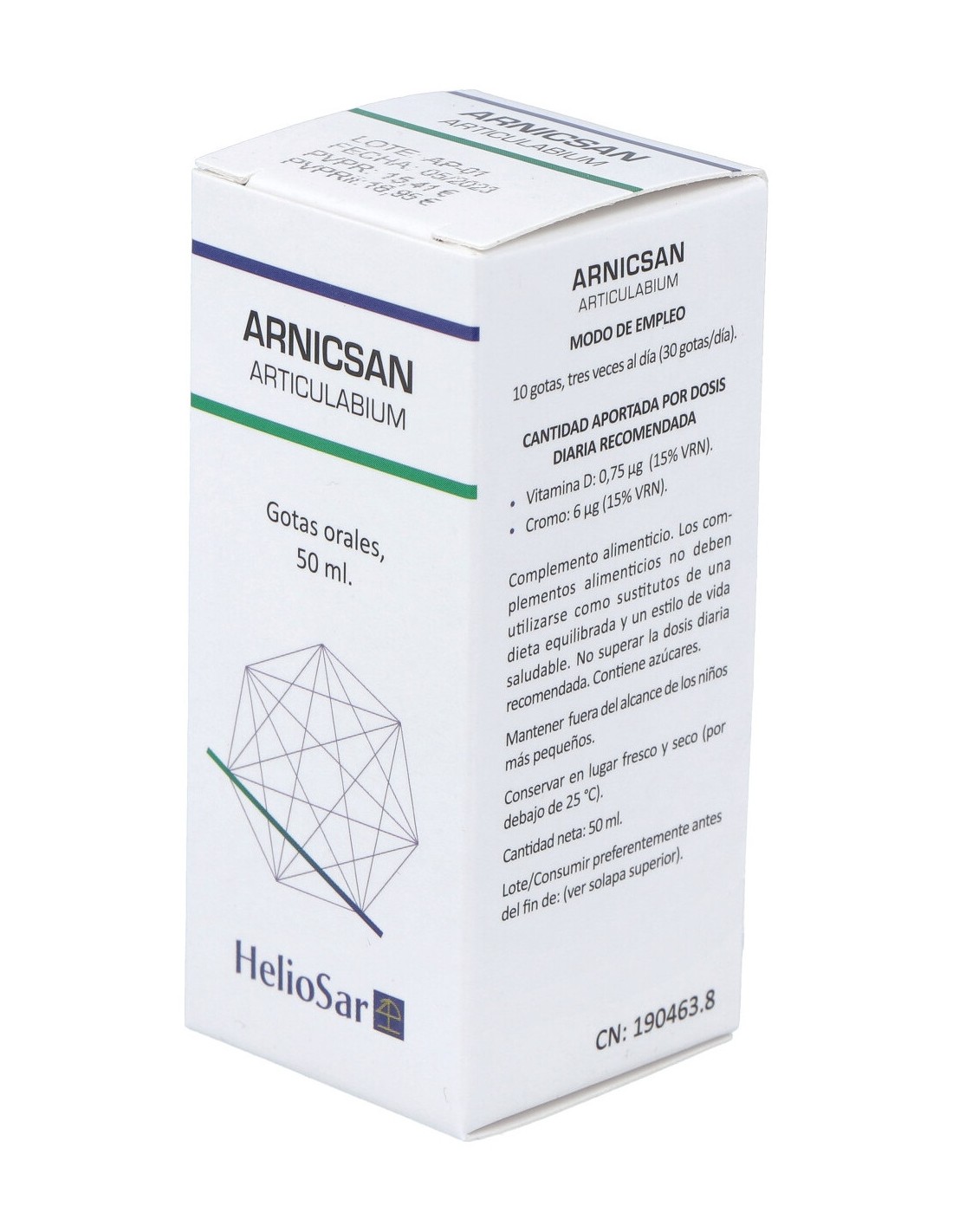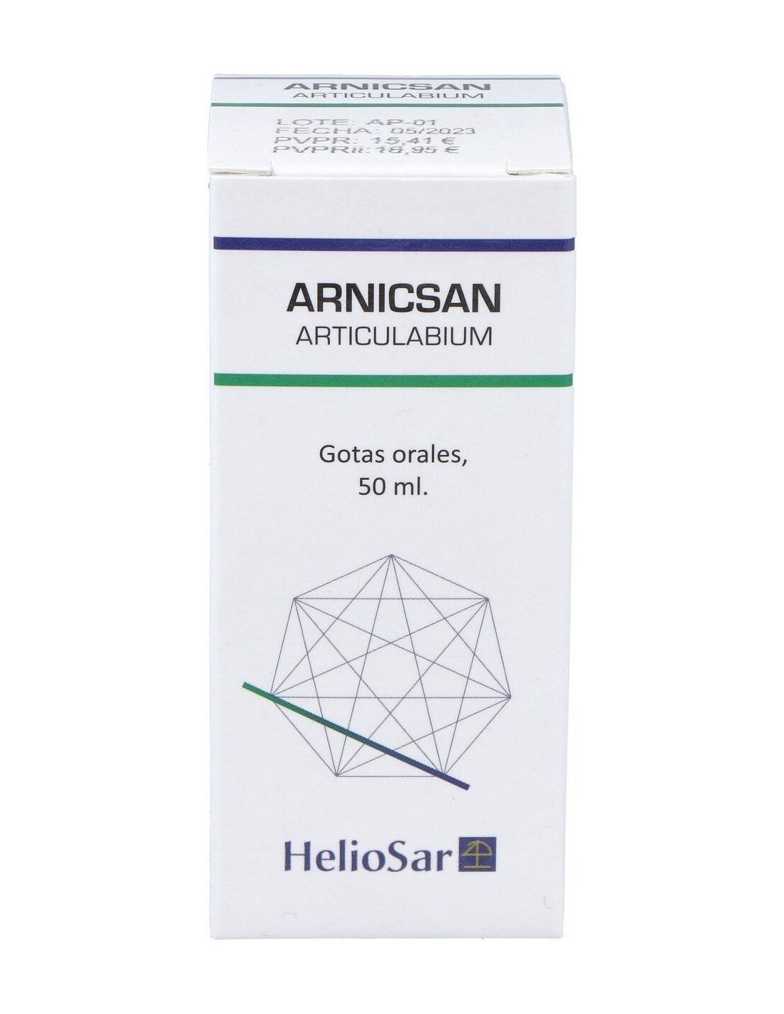 Arnicsan Articulabium HelioSar, complemento alimenticio para tratamiento homeopático. Fórmula con contenido en vitamina D que contribuye al mantenimiento de los huesos en condiciones normales; y al funcionamiento normal de los músculos. El producto resulta en solución acuosa de mezcla de extractos de plantas de uso tradicional: Abies alba, Aegopodium podagraria, Apium graveolens, Curcuma xanthorrhiza, Harpagophytum procumbens, Pastinaca sativa, Sanicula europaea, Fructosa, Sorbitol, Colecalciferol, (Vitamina D), Picolinato de cromo, Cloruro cálcico.