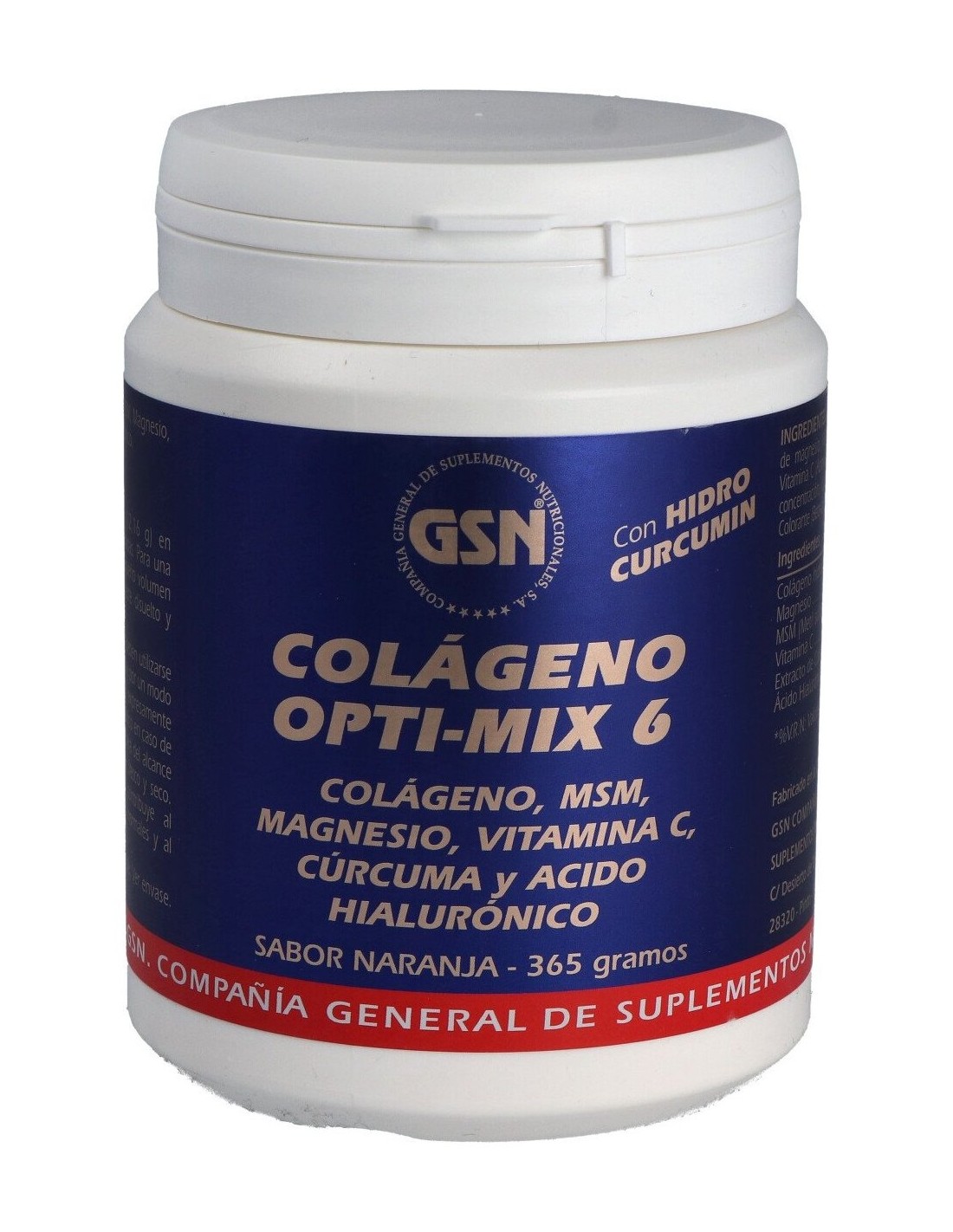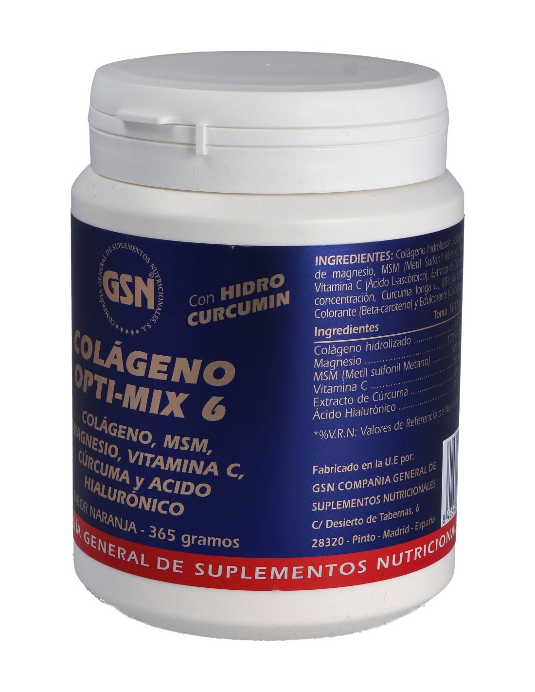 Colágeno hidrolizado, Acidulante (Ácido cítrico), Carbonato de magnesio, MSM (Metil Sulfonil Metano), Aroma (Aroma de Naranja), Vitamina C (Ácido L-ascórbico), Extracto de Cúrcuma HIDRO CURCUMIN (90%concentración, Cúrcuma longa L, 85% Curcuminoides), Ácido Hialurónico, Colorante (Beta-caroteno) y Edulcorante (Glicósidos de esteviol).