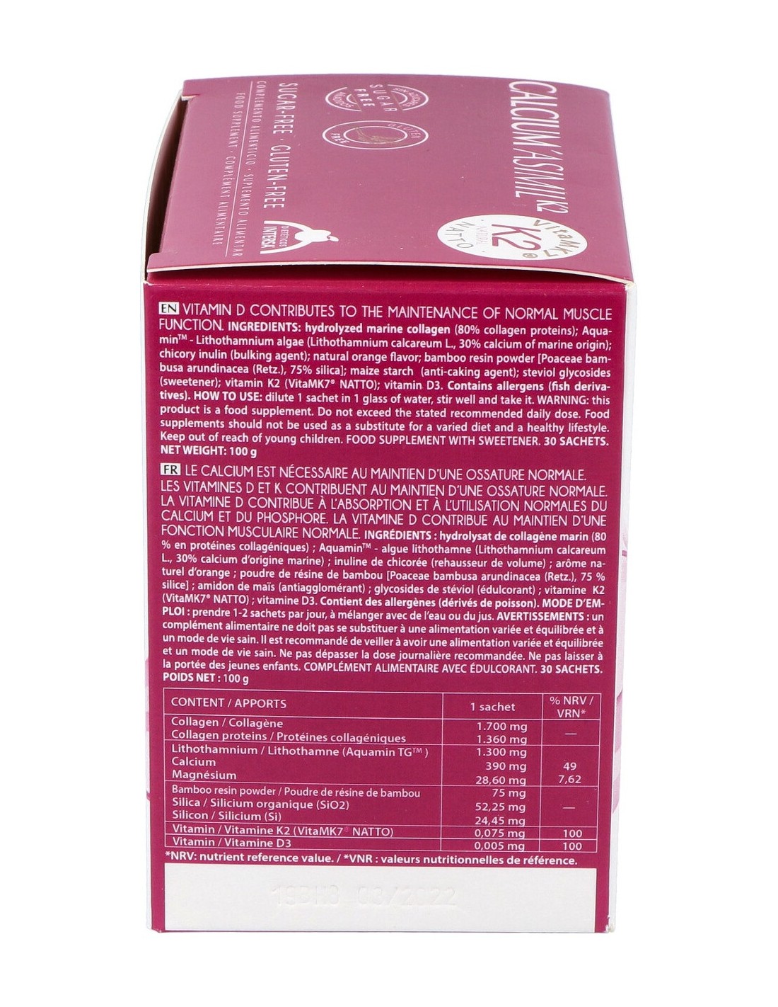 Hidrolizado de colágeno marino (80% en proteínas colagénicas); AquaminTM - alga litotamno (Lithothamnium calcareum L.), 30% calcio de origen marino; inulina de achicoria (incrementador de volumen); aroma natural de naranja; polvo de resina de bambú [Poaceae bambusa arundinacea (Retz.)], 75% sílice; almidón de maíz (antiaglomerante); glucósidos de esteviol (edulcorante); vitamina K2 (VitaMK7® NATTO); vitamina D3.