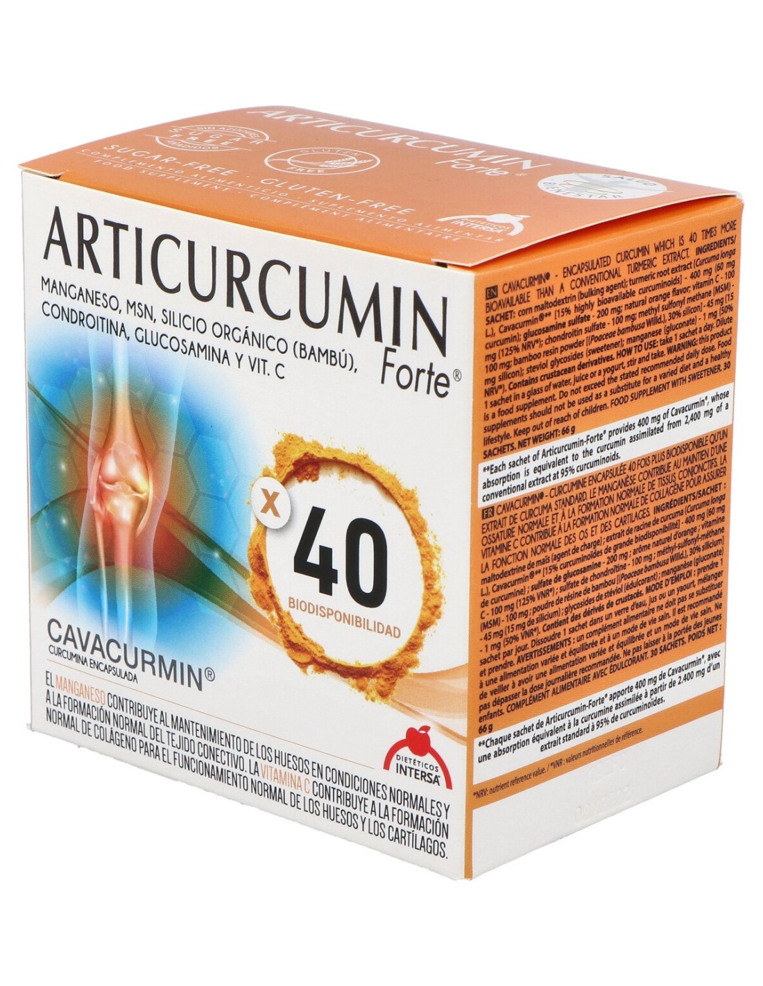 Maltodextrina de mai´z (incrementador de volumen): extracto de rai´z de cu´rcuma (Curcuma longa L.), Cavacurmin® [15% curcuminoides de alta biodisponibilidad] - 400 mg (60 mg de curcumina): sulfato de glucosamina - 200 mg: aroma natural de naranja: vitamina C - 100 mg (125% VRN): sulfato de condroitina - 100 mg: metil sulfonil metano (MSM) - 100 mg: polvo de resina de bambu´ [(Poaceae bambusa Willd.), 30% de silicio] - 45 mg (15 mg de silicio): gluco´sidos de esteviol (edulcorante): manganeso (gluconato) - 1 mg (50% VRN).