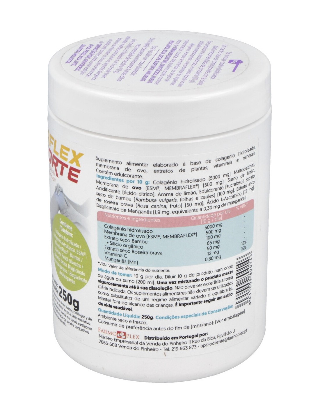 (Por 10g) Colágeno hidrolizado (5000mg), Maltodextrina, Membrana de Huevo (ESM®, MEMBRAFLEX) 500 mg, Zumo de Limón, Acidulante (Ácido Cítrico), Aroma natural de Limón, Edulcorante (Sucralosa). Extracto seco de Bambú (Bambusa Vulgaris, hojas y tallos, 100 mg), Extracto seco de Rosa Silvestre (Rosa Canina, fruto 50 mg), Ácido L-ascórbico 12mg, Bisglicinato de Manganeso 1,9mg (equivalente a 0,30mg de Manganeso).